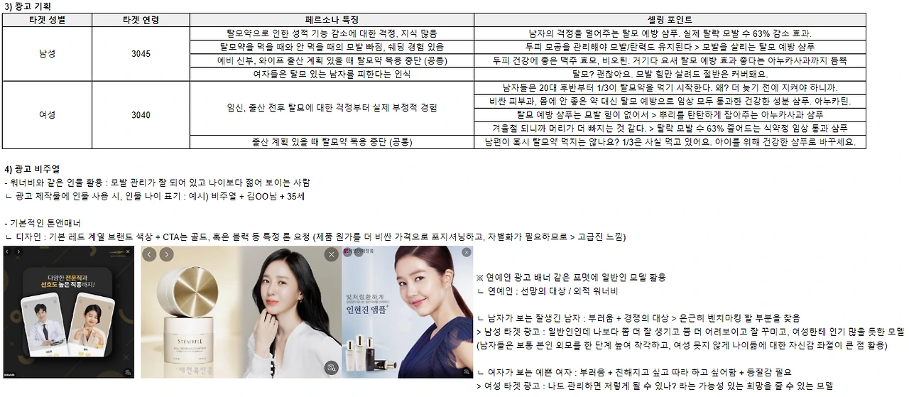탈모약의 부작용을 갖고 있는 사람들로 시작했고, 남성의 모발량과 컨디션이 돈을 조금 벌기 시작하는 해당 연령 한국 남성들에게 얼마나 중요한지에 대한 부분을 짚었다. 아주 작은 DA 지면 하나로 후킹해야 하기 때문에, 비포&애프터 컷부터 다양한 형태의 헤드카피를 소구 했다.