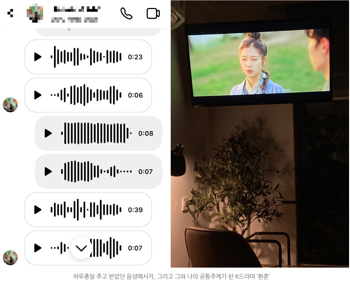 나는 그가 태국여행을 시작하면 솔로여행 중 낯선 이와 만나 불꽃같은 로맨스에 빠져 나를 잊지 않을까 조바심이 났다 (내 경험을 토대로 생각함). 그러나 그는 여행 중에도 거의 매일매일 내게 하루일과에 대해서 알려주었다. 그는 내게 기다리는 동안 K드라마 '환혼'을 꼭 보라고 추천해줬고, 나는 보통 TV를 보는 사람이 아니지만 그와 조금이라도 공통 주제가 있었으면 하는 마음에 드라마를 보기 시작했다. 보다보니 너무 재미있었던건 안 비밀..