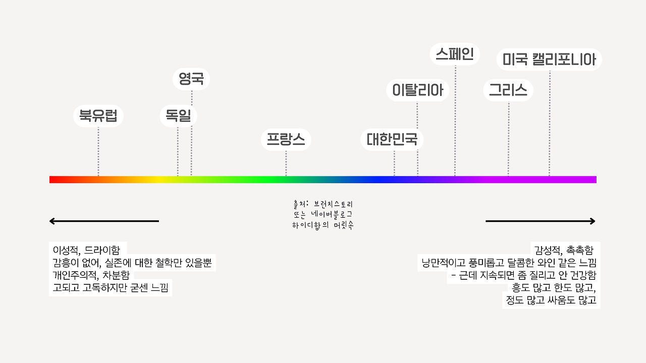 예, 봤습니다. 그 이유는 바로 필자의 현재 일상에 직접적으로 감흥을 주고 있는 사람이 프랑스 사람이기 때문입니다요. 좋아하는 감정까지는 아니고, 탐구 대상이에요. 이 사람을 향한 관심은 이 '특정인물'에 대한 집중된 관심이라기보다는 필자 본인의 자아를 찾기 위한 관심이라고 볼 수 있는데요. 어린 시절 독일어권 유럽국가에서 8년을 살고, 그 외에 대한민국에서 학창 시절과 사회생활을 하면서 제3문화권의 아이(Third Culture Kid), 즉, 이도저도 아닌 문화적 돌연변이가 되었다고 생각했습니다. 정서적 문화적 스펙트럼을 하나의 긴 수평적인 선으로 그려내어 설명할 수 있다면 아래와 같을 것이라는 생각을 해왔거든요. 다시 일기식 문체로 돌아갈게요.