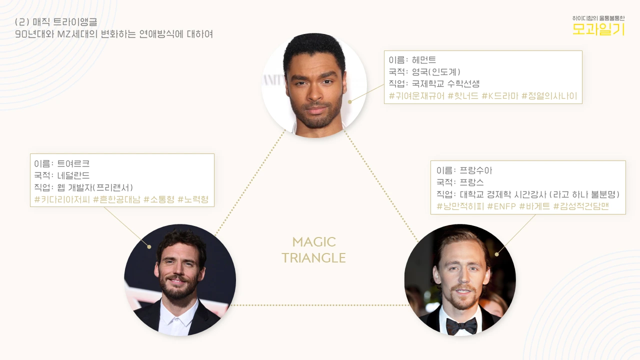 옛날 옛적 썸남이 굉장히 많았던 날들이 있었다. 지나간 기억에 대해 머릿 속에서 과장되게 미화된 것일 수도 있지만.. 실로 이성이 끊이지 않고 다가오던 시절이 있었다. 그당시 우스개소리지만 농담으로 친구들과 하던 말이 있었다. 연애에 있어 쉽게 마음이 동요되거나 찌질해지지 않기 위해, 이성적으로 여유있고 매력적인 여성이 되기 위해서는 매직 트라이앵글을 만들어야 한다고. (지금 생각해보면 좀 문제적인 발언 같은데.. 당시에는 많이 어렸으니 철없음을 너그럽게 이해해주었으면 한다)