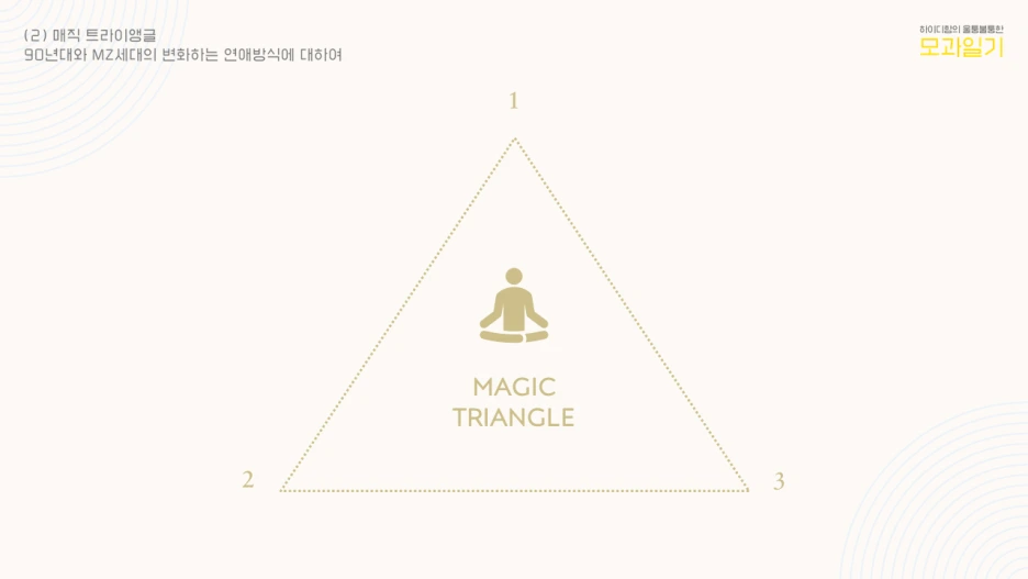 매직 트라이앵글이란 3명 이상의 썸남/썸녀를 두는 것을 말한다. 남자친구/여자친구가 있는 사람이 이 이론을 실천한다면 두 말 할 것 없이 윤리적으로 문제가 있지만, 상대방의 마음을 확신할 수 없는 단계의 솔로에게는 문제가 될 것이 없다고 보았다. 사실 만나야 할 인연은 감정을 재고 밀당을 할 필요도 없이 너무 자연스럽게 순리대로 서로에게 일대일로 빨려 들어가게 된다고 생각한다. 그것이 가장 이상적이라고 생각하지만 안타깝게도 모든 연애가 그렇게 시작하지는 않는다. 그리고 그것만이 옳은 방법의 연애라고 생각하지 않는다. 여러 명을 동시에 만나는 것을 습관화하는 것은 독이 된다. 하지만 매직 트라이앵글의 긍정적 효과는 호르몬과 감정에 미쳐 스스로를 해치는 도박적인 사랑을 피할 수 있다는 것이다. 그리고 그런 사랑에 빠진 후 실패하더라도 다시 회복할 수 있는 베이스를 다져준다는 것이다.