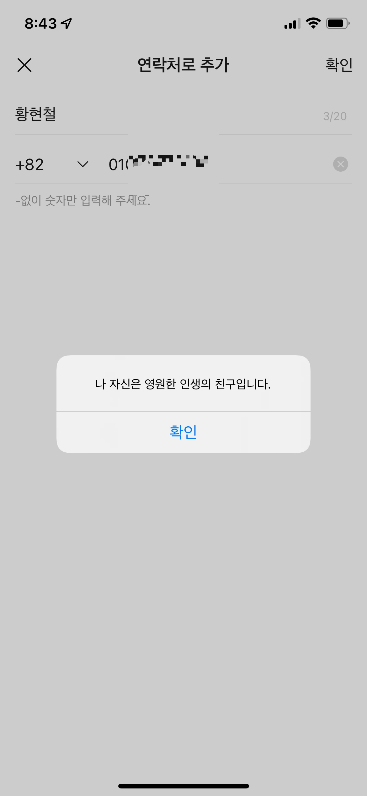 내 이름과 전화번호를 입력하고 확인을 누르니 바로 뜬 메시지 창, '나 자신은 영원한 인생의 친구입니다.' 아 그런데 이게 설명되지 않는 먹먹함이 있습니다. 바로 확인을 눌러 메시지창을 지우지 못하고 캡처를 하게 하는 힘이 있습니다. 어쩌면 이렇게 절묘한 타이밍에 (어떤 사람과 멀어져야 하는가에 대한 글을 발행 한) 이런 메시지를 받게 되다니요.