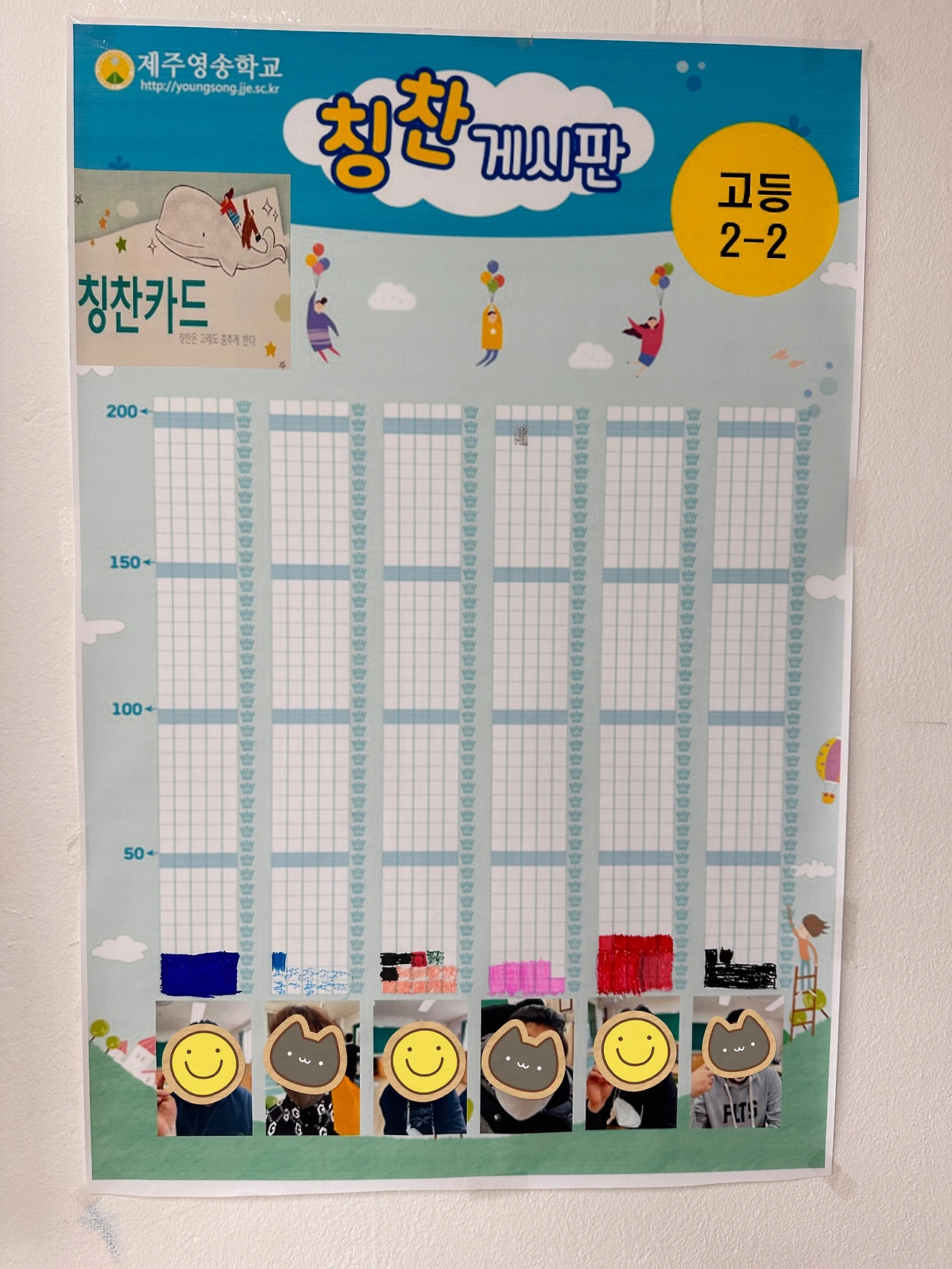 아이들에게 칭찬카드는 매우 소중합니다. 그래서 한 장 받을 때마다 스스로 기록하도록 하고 있지요. 스스로 기록하고 관리할 수 있도록 말입니다. 여기서 나의 것과 다른 학생의 것을 구분하는 분별력, 그리고 한 칸 한 칸 세며 채워가는 연산력, 한 칸을 알록달록 채우는 예술적 감성까지도 기대할 수 있습니다. 색의 선택, 채움의 방식 (색으로 채우기, V표시하기, 사선 긋기)은 학생 스스로 선택합니다. 어떠한 방식으로든 원하는 대로 할 수 있습니다.