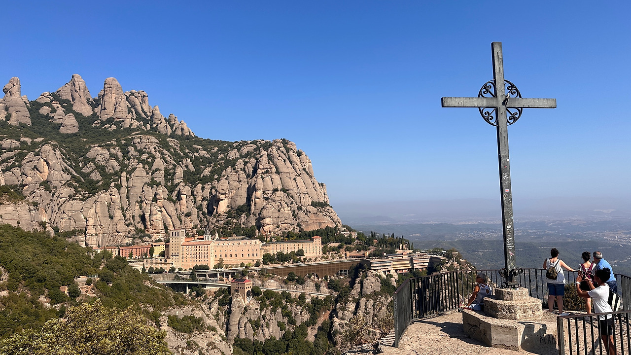 시간이 남아 산책로를 따라 걷기로 했다. 산책로를 따라 십자가 전망대(Cruz de San Miguel)까지 올라가면, 눈앞에 몬세라트 수도원과 거대한 바위산이 한눈에 내려다보인다. 수도원에서 보는 경관도 장관이지만 또 반대에서 수도원을 바라보는 풍경 또한 장관이었다. 수많은 관광객이 감탄사를 쏟아내며 사진을 찍고 있었고, 나 역시 숨을 고르며 이 장관을 담아두었다. 저 멀리까지 이어지는 카탈루냐 평야와 자연의 거대한 스케일, 그리고 그 위에 우뚝 선 십자가는 ‘인간’과 ‘신성’의 경계를 잇는 상징처럼 보였다.