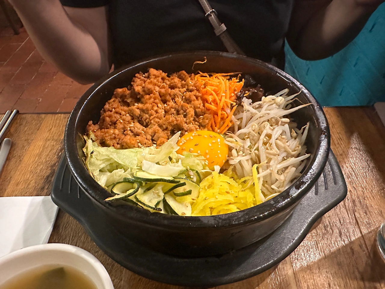 사장님이 물어보셨습니다. 왜, 다들 여행 가방에 컵라면이며 깻잎이며 캔으로 된 반찬들과 김치들을 챙기지 않느냐는 말씀이셨죠. "그러게요"하고 애꿎은 미소만 보이던 찰나, 주문했던 비빔밥이 등장했습니다. 돌솥에 담겨 나온 비빔밥은 정말 먹음직스러웠어요. 스페인에서 먹어보는 비빔밥이라니 감회가 새롭다는 표현은 이럴 때 딱 어울리는 말입니다.