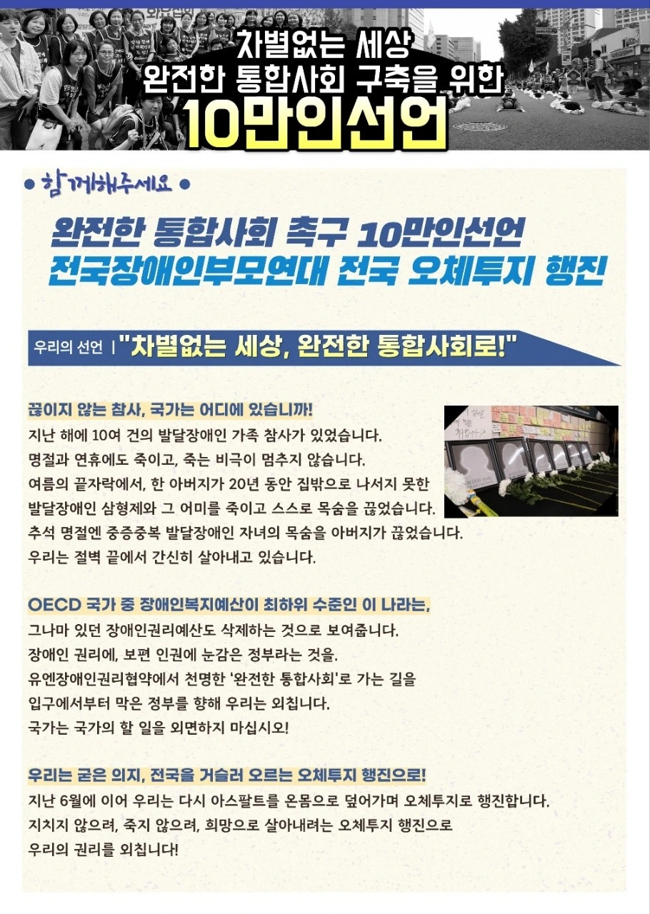 2023년 11월 15일, 제주도청 앞 길에 엄숙함이 몰려왔다. 수능을 하루 앞둔 이 날, 비장한 표정의 장애인부모연대의 회원들이 모인 것. 모인 장소는 제주도청과 제주도교육청, 제주도의회가 서로 마주 보고 있는 곳. 이곳에서 선언된 선포기자회견을 시작으로 12개 시도를 거쳐 서울 국회까지 오체투지로 나간다는 설명이다. 오체투지란 머리부터 발끝까지 아스팔트에 그대로 누이며 한 걸음씩 나아가는 것으로 삼보를 걷고 일 배를 하는 삼보일배와 다르다.
