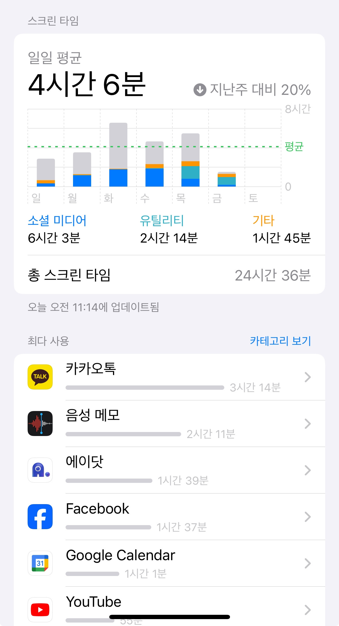 일일로 검색하면 편차가 매우 크게 느껴질 수 있어 주간으로 검색해 보았습니다. 일주일 평균으로 계산할 때 저는 하루에 스마트폰을 평균 4시간 6분 사용하고 있었습니다. 지난주 대비 20%가 감소했다는 것에서 평소에는 조금 더 사용한다고 추측할 수 있겠습니다. 요일로는 화요일, 수요일, 목요일에는 평균을 웃도는 사용을 했고, 나머지 요일에는 평균에 밑도는 시간을 사용했네요.