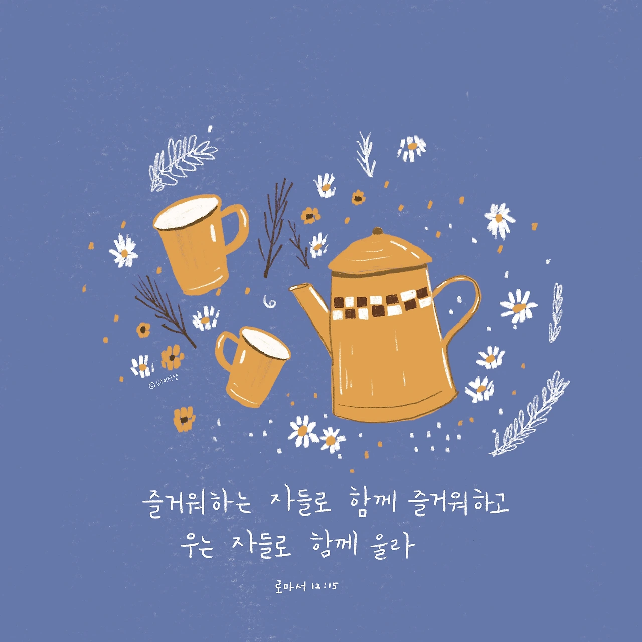 즐거워하는 자들과 함께 즐거워하고 우는 자들로 함께 울라. 로마서 12:15Rejoice with them that rejoice, And weep with them that weep. 좋은일이 있을 때 진심으로 함께 기뻐하고,슬픈 일이 생겼을 때 옆에서 위로가 되어주고 힘이 되어주고 함께 기도해주는 그런 하나님의 사람 되길 원합니다. 함께 걸어가요!