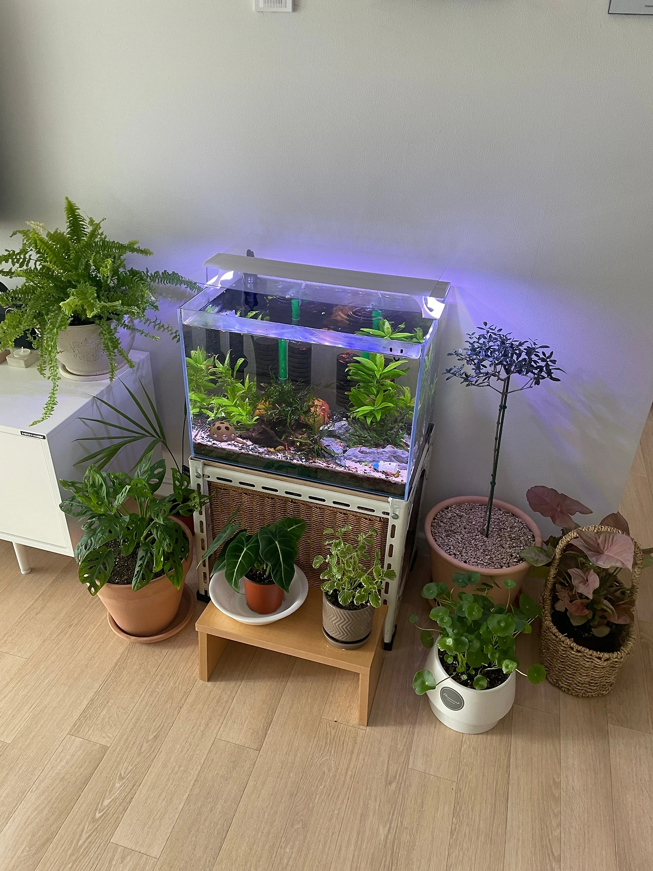화분에 물을 주고, 수중식물은 물을 버리고 갈아주었다.