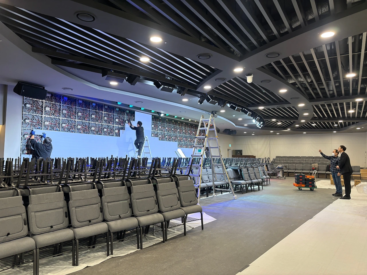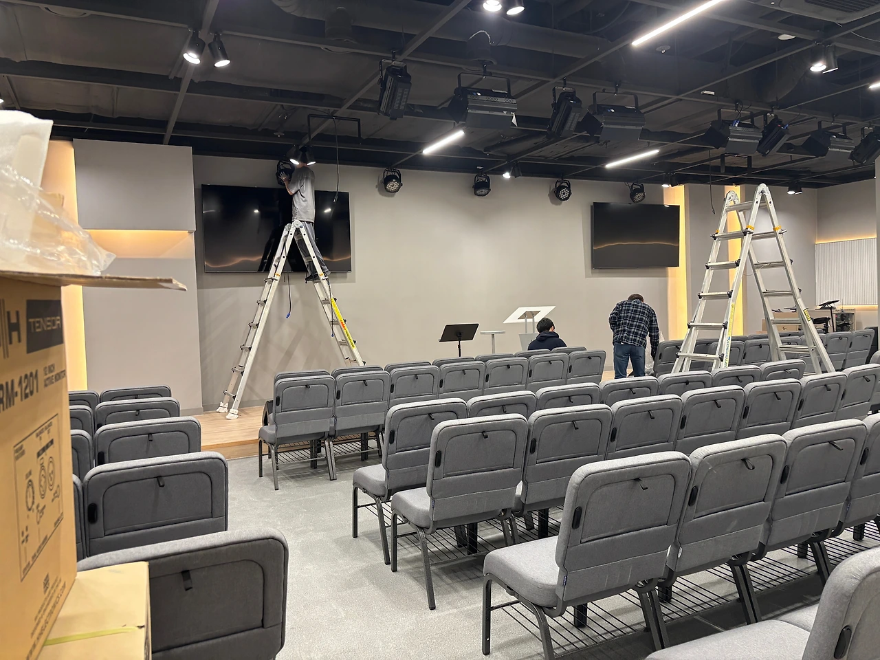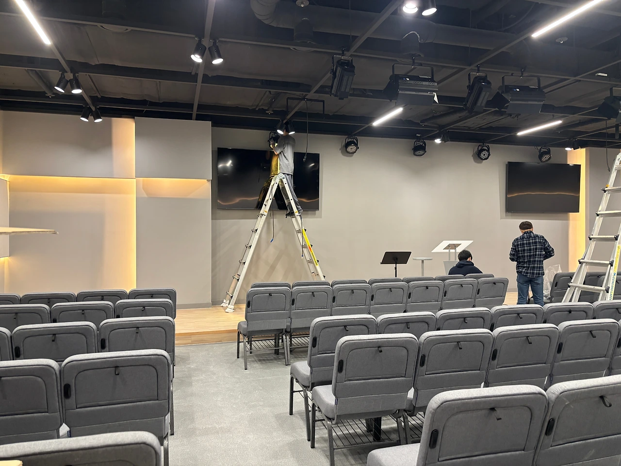 가장 궁금했던 본당 스크린. 사이즈가 꽤 커서 어떻게 설치가 될지 궁금했는데 완성되어 가는 과정을 보는 것도 참 흥미로웠다. 분야별로 ( 음향, 스크린, 조명, 목공등) 전문가분들이 오셔서 맡은 일들을 척척 해내는 모습이 신기하기도 하고 새로운 경험이었다. 이렇게 분야별로 전문가들이 모여 교회건물이 완성되어 가는 모습이 앞으로 우리 교회 공동체가 만들어가야 하는 교회의 모습이라는 생각이 들었다. 각자 맡은 자리에서 주어진 달란트로 최선을 다해 하나님을 섬길 때 아름다운 교회가 만들어진다는 것이다.