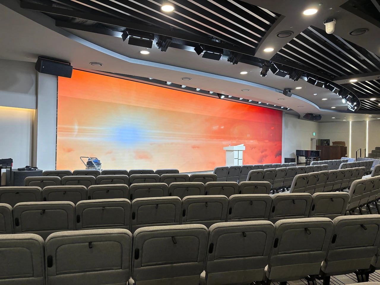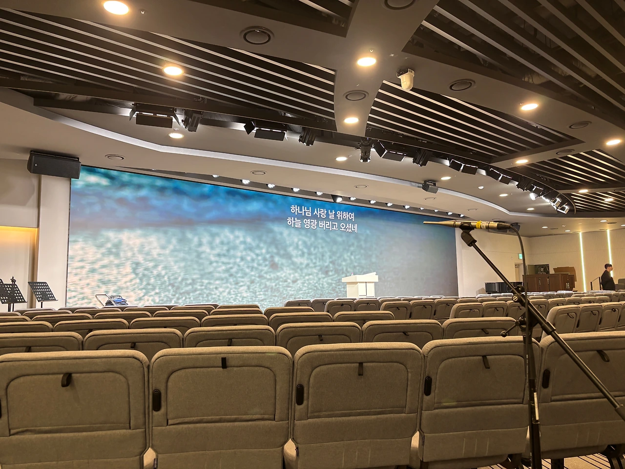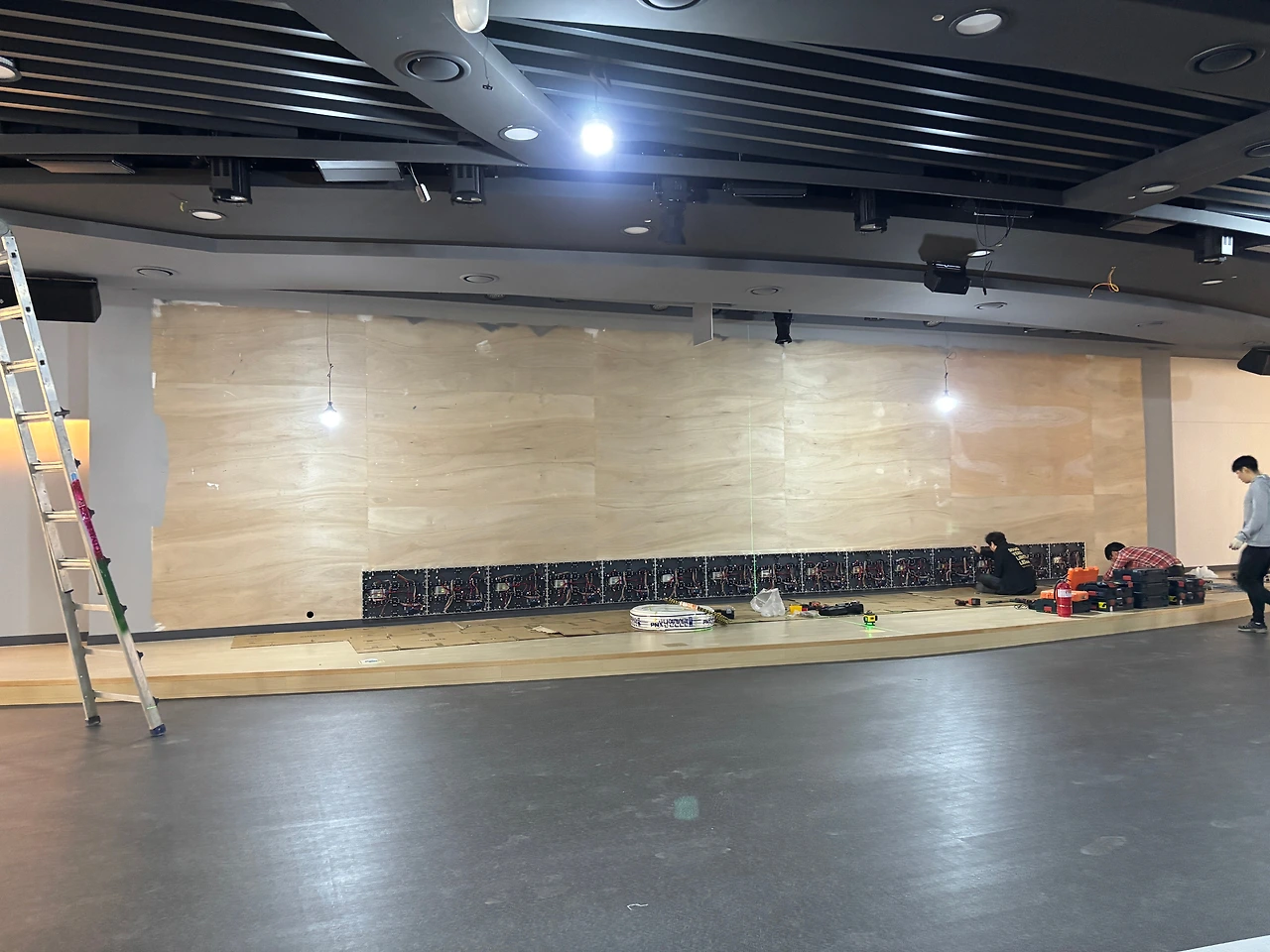 가장 궁금했던 본당 스크린. 사이즈가 꽤 커서 어떻게 설치가 될지 궁금했는데 완성되어 가는 과정을 보는 것도 참 흥미로웠다. 분야별로 ( 음향, 스크린, 조명, 목공등) 전문가분들이 오셔서 맡은 일들을 척척 해내는 모습이 신기하기도 하고 새로운 경험이었다. 이렇게 분야별로 전문가들이 모여 교회건물이 완성되어 가는 모습이 앞으로 우리 교회 공동체가 만들어가야 하는 교회의 모습이라는 생각이 들었다. 각자 맡은 자리에서 주어진 달란트로 최선을 다해 하나님을 섬길 때 아름다운 교회가 만들어진다는 것이다.