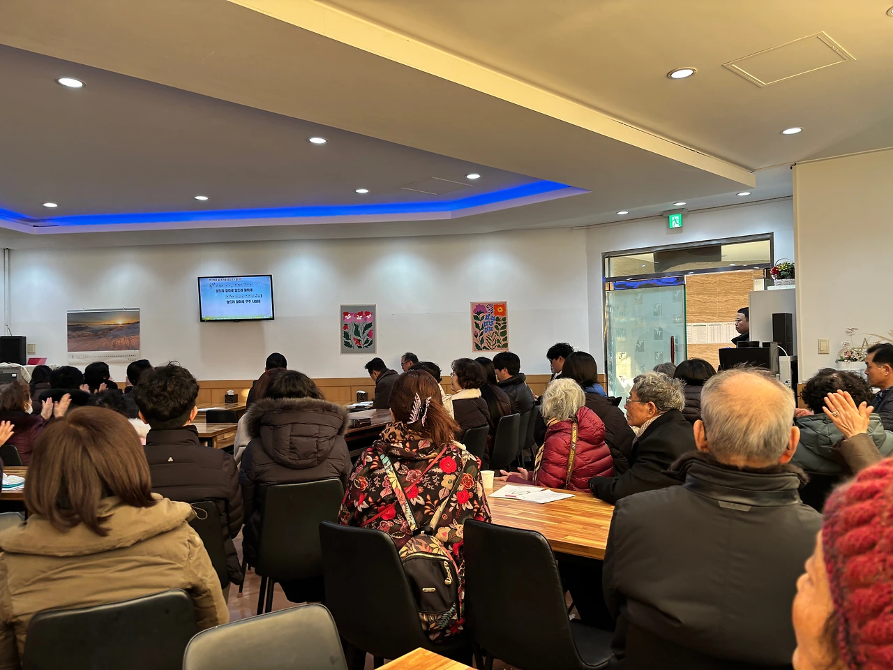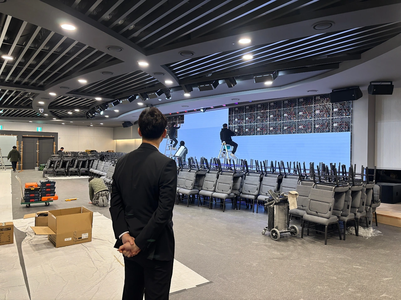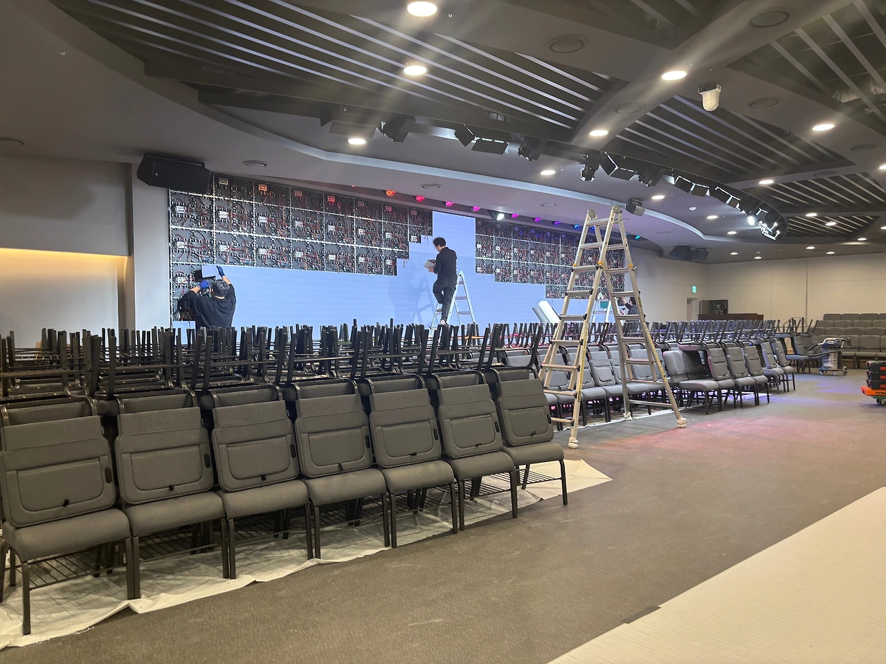 드디어 스크린 설치도 끝나고 의자 배치도 모두 끝이 났다. 의자가 생각보다 꽤 무거운데 성도님들 모두 함께 나오셔서 의자를 나르고 배치하고... 몸은 힘들었지만 마음은 참 기뻤던 것 같다.