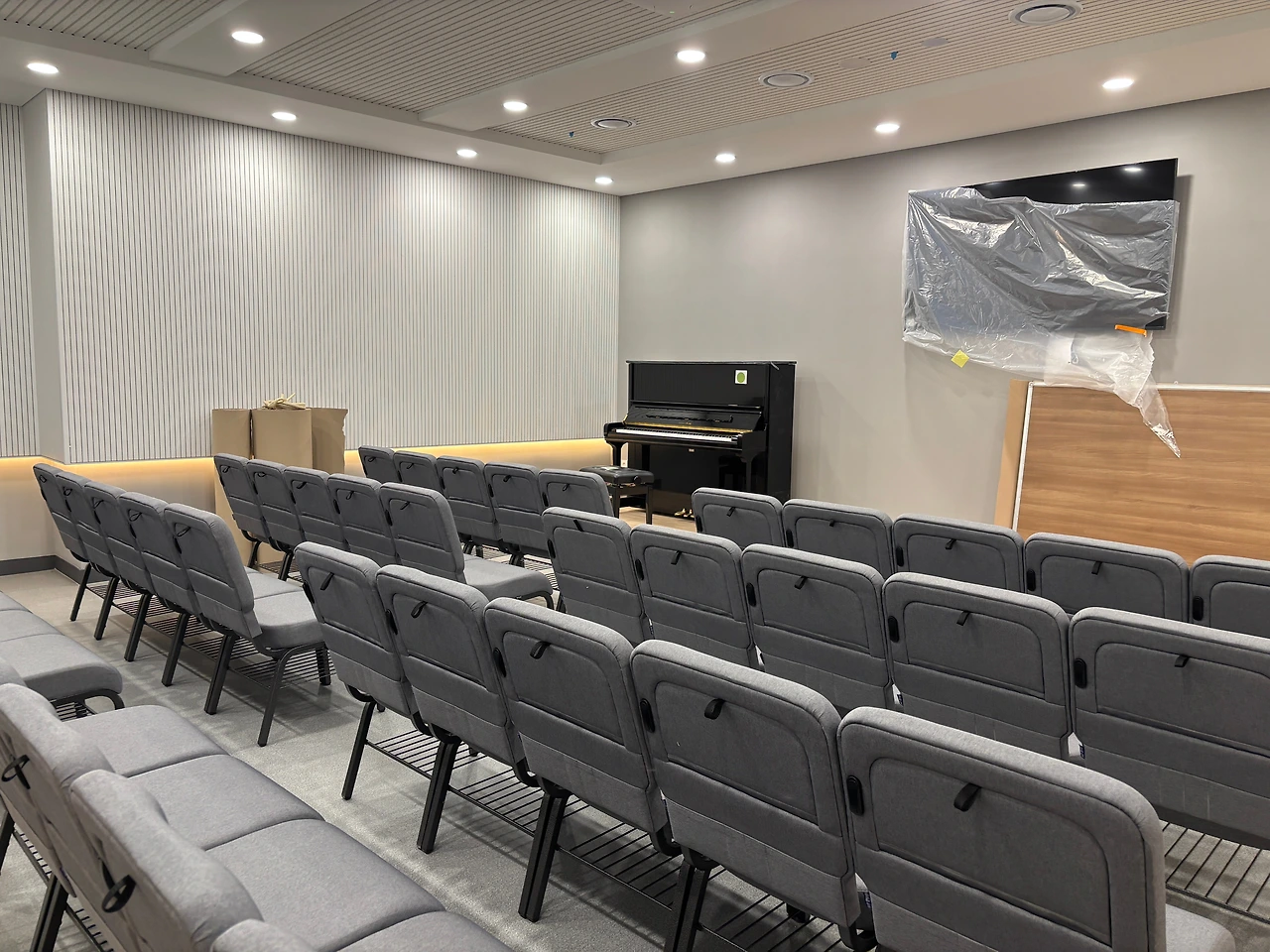 이곳은 소예배실. 앞으로 청년부예배와 새벽예배가 이곳에서 드려진다. 티비가 설치되고 조명이 달리고 의자가 놓이고.. 정말 완성되어 가는구나 싶었다.