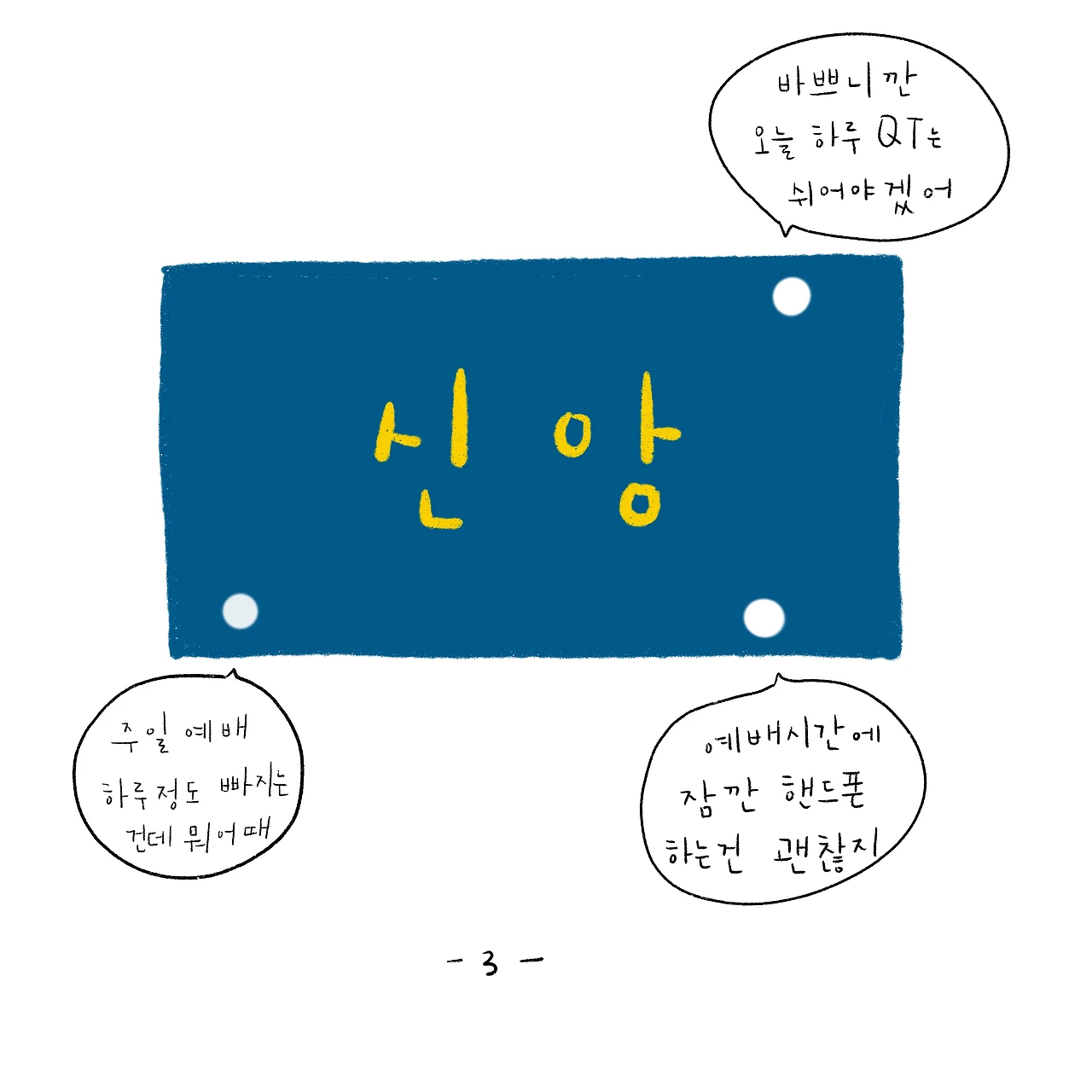 집에서 온라인으로 예배를 드릴때, 옷좀 편하게 입고 드려야지 하고 하나를 타협하다 보면 자세도 흐트러지고 집중력도 떨어진다. 아이들과 있는 시간이 늘어나다 보니 바쁘다는 핑계로 “오늘 큐티는 좀 쉬어야지” 하다보면 그 다음날도 그다음날도 핑계를 대며 하지 않게 된다. 순간 순간 보기에는 작은 것이지만 그것들이 쌓이고 쌓이다 보면 나중에 얼마나 크게 돌아오는지 알기 때문에, 할 수 있으면 타협하지 않으려고 노력한다. 하지만 연약한 사람인지라,,, 참 쉽지가 않다. 변화된 예배 환경으로 신앙을 지키기 좀 더 힘들 수 있다고 생각한다. 그럴수록 하나라도 작은것이라도 하나님과의 관계를 지키기 위해 노력하고 애써야겠다.