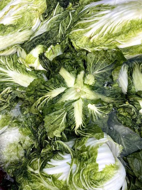 절인 배추에 낙엽 조각이 붙은 채로 배추를 쌓아놓았다고 지적을 받습니다. 영혼 없이 일을 한다는 거지요. 한번 헹군 배추가 그대로 속 넣는 공정으로 간다는 걸 모르니까 대충 씻었지요. 다시 배추를 물속에 집어넣습니다.