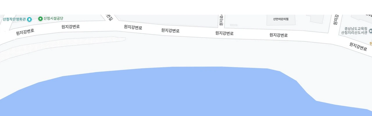 남덕유산에서 발원한 경호강이 산청군을 거쳐 남류하다 양천강과 합수하는 지점에 원지가 위치하고 있다. 시외버스 정류소가 있는 번화한 원지로에 비해 시가지 언저리에서 두물머리를 끼고도는 원지 강변로는 운치가 있고 차분하다.