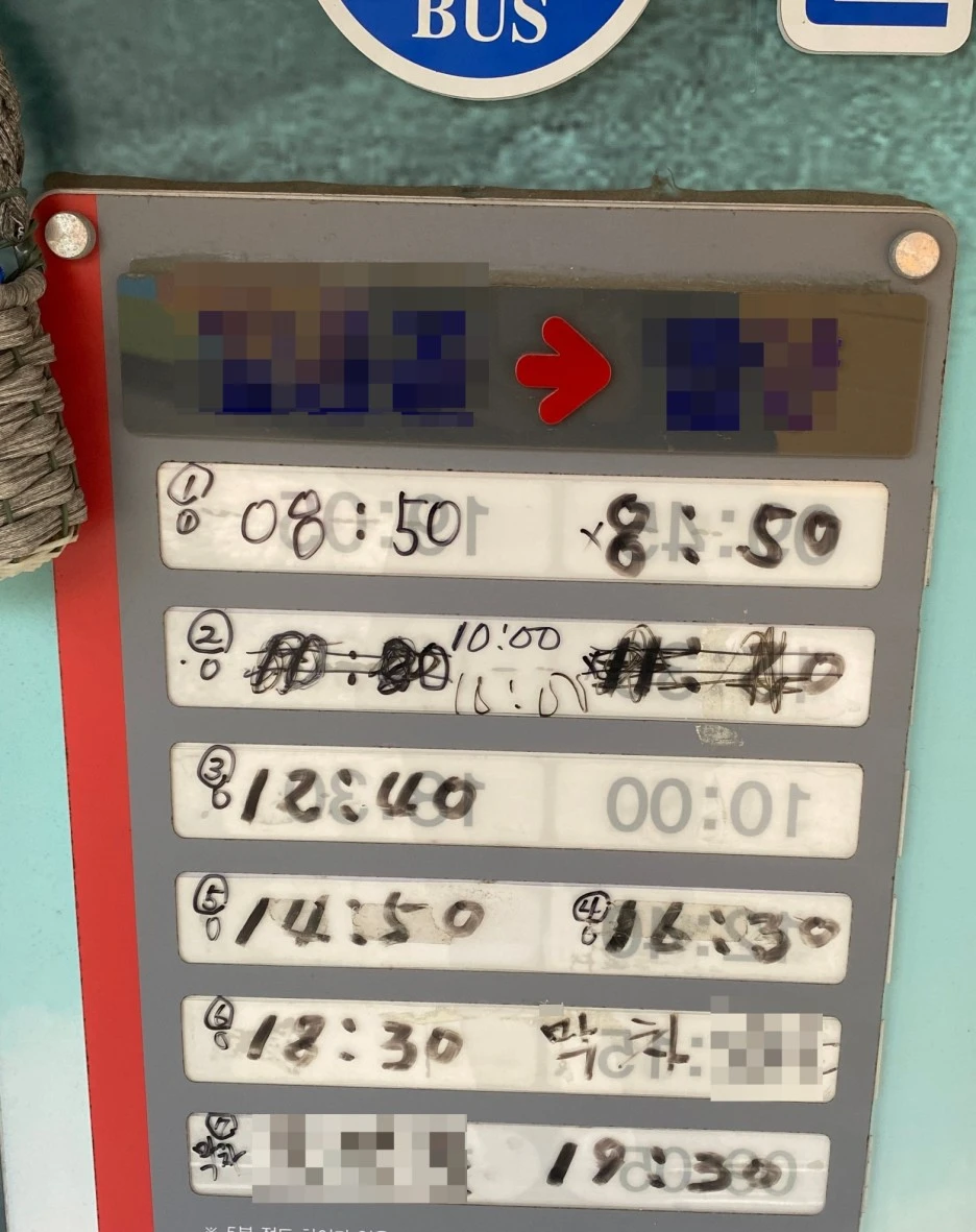 정거장에 붙어있는 버스 시간표가 심란하다. 운행 시간이 자주 바뀌는지 덕지덕지 덧 칠을 해놓아서 해독하는데 숨은 그림 찾기 실력이 필요하다.