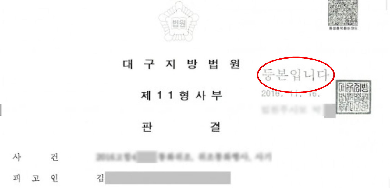 판결문의 귀퉁이에 '등본입니다'라는 고무도장이 찍혀있다. '등본'에 사족처럼 '입니다'를 달아서 7자로 만들어 놓았다.