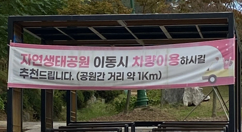'자연생태 공원으로 가려면 차를 타고 가는 게 좋다'라는 취지의 안내문.