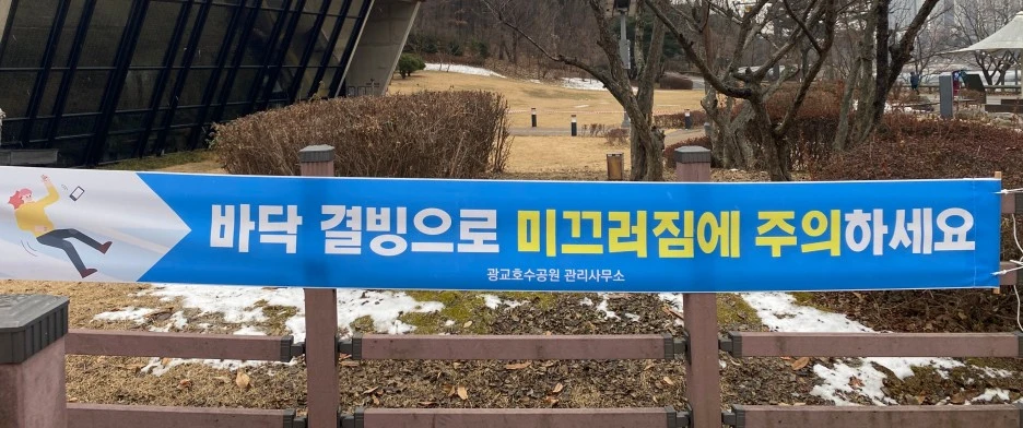 '바닥이 얼어서 미끄러우니까 조심하라'는 안내문.