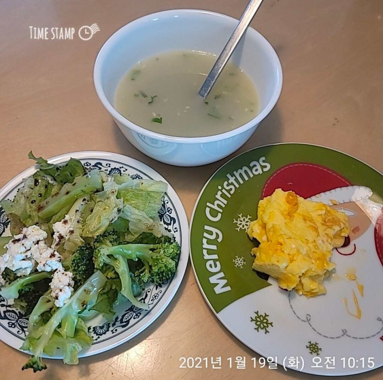 버터 넣은 사골국, 양상추 브로콜리 리코타치즈 발사믹소스 샐러드, 치즈오믈렛