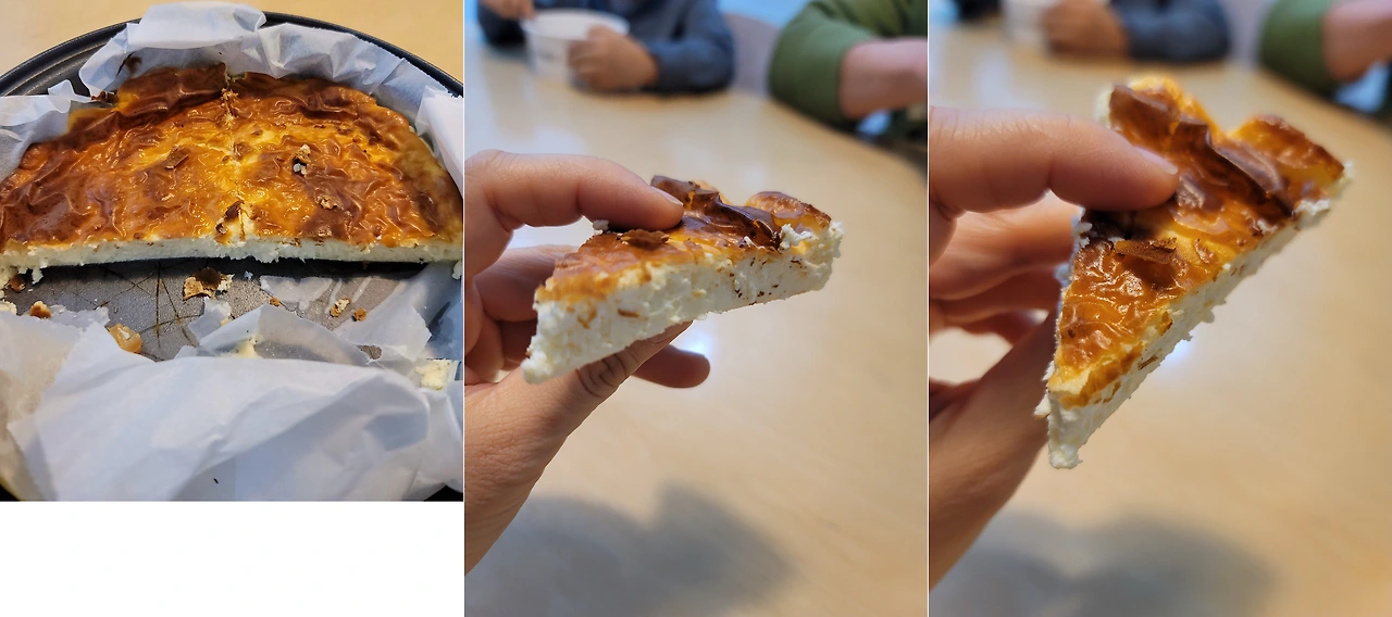 크림치즈로 미리 구워 놓은 바스크 치즈케이크를 냉장고에서 꺼내 한 조각씩 후식으로 냠냠~