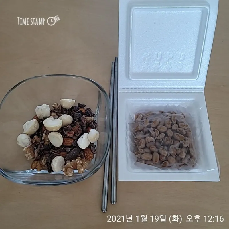 호두, 아몬드 총 25g, 카카오닙스 한 줌, 마카다미아 10알, 애사비 식초 한 숟갈 섞은 낫또