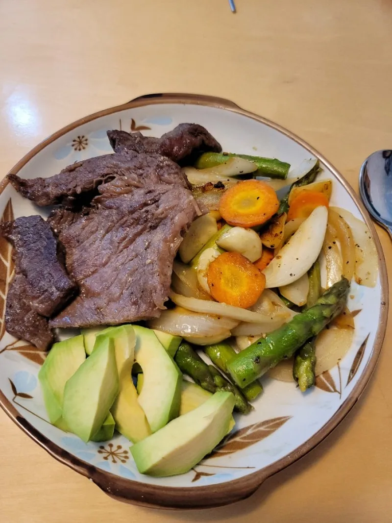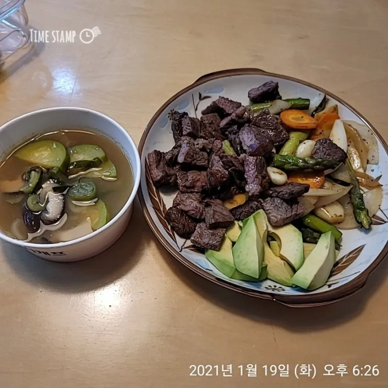소고기 스테이크, 야채구이(당근, 양파, 아스파라거스, 통마늘), 아보카도, 가리비 삶은 물로 끓인 된장국