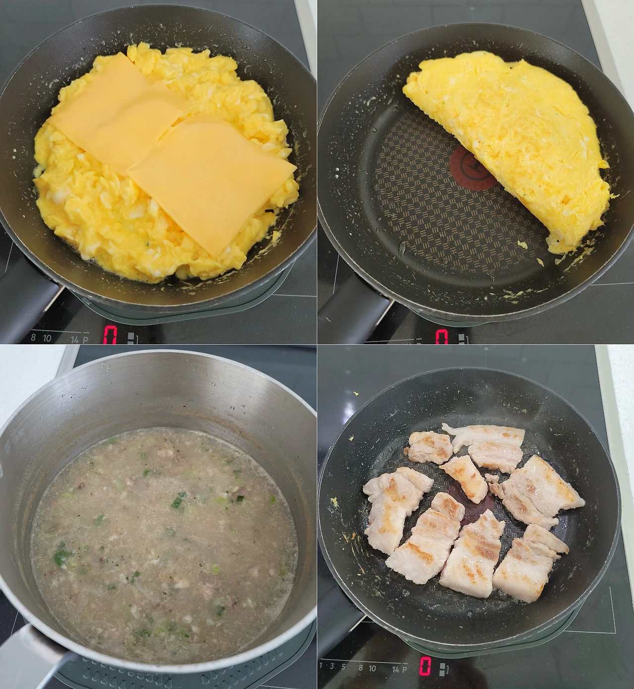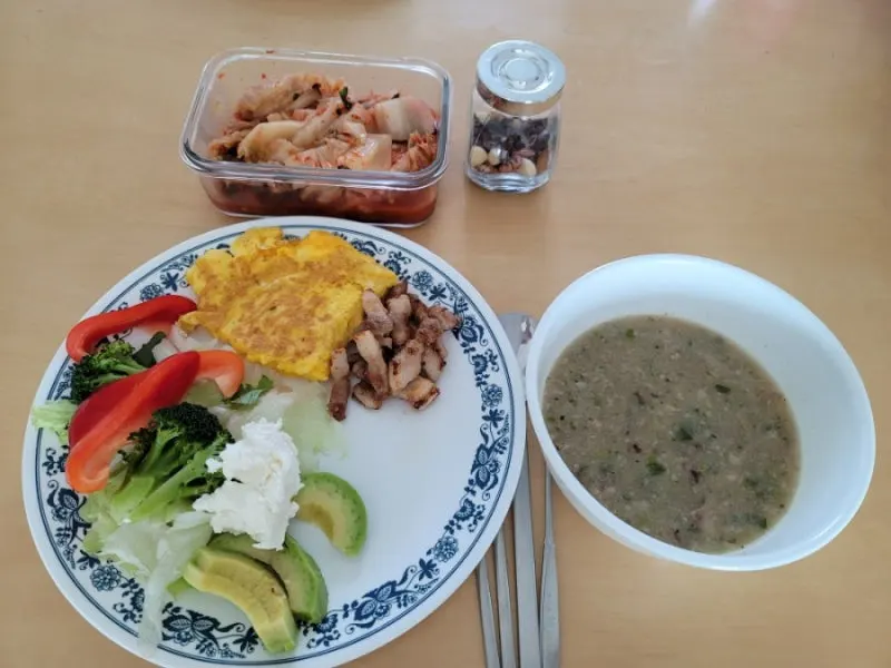 치즈오믈렛, 양상추 브로콜리 파프리카 리코타치즈 샐러드, 아보카도, 삼겹살, 사골야채수프(후식으로 호두마루맛 아이스크림)