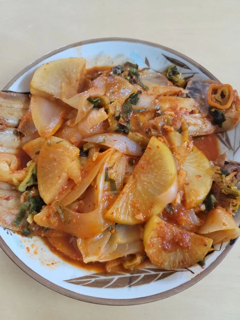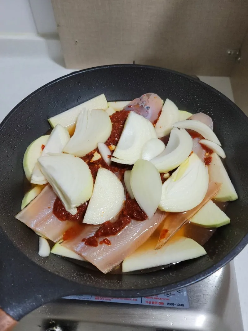 얼른 집 앞에 나가 무를 사 왔다. 무를 약간 도톰하게 썰어서 바닥에 깔고 박대 꼬리 잘라서 프라이팬 사이즈에 맞춰 넣고 양념을 골고루 발랐다. 그 위에 양파를 올려두고 물 자작하게 넣어서 끓이기. 어느 정도 끓는다 싶으면 파 넣고 한소끔 더 끓이면 완성!