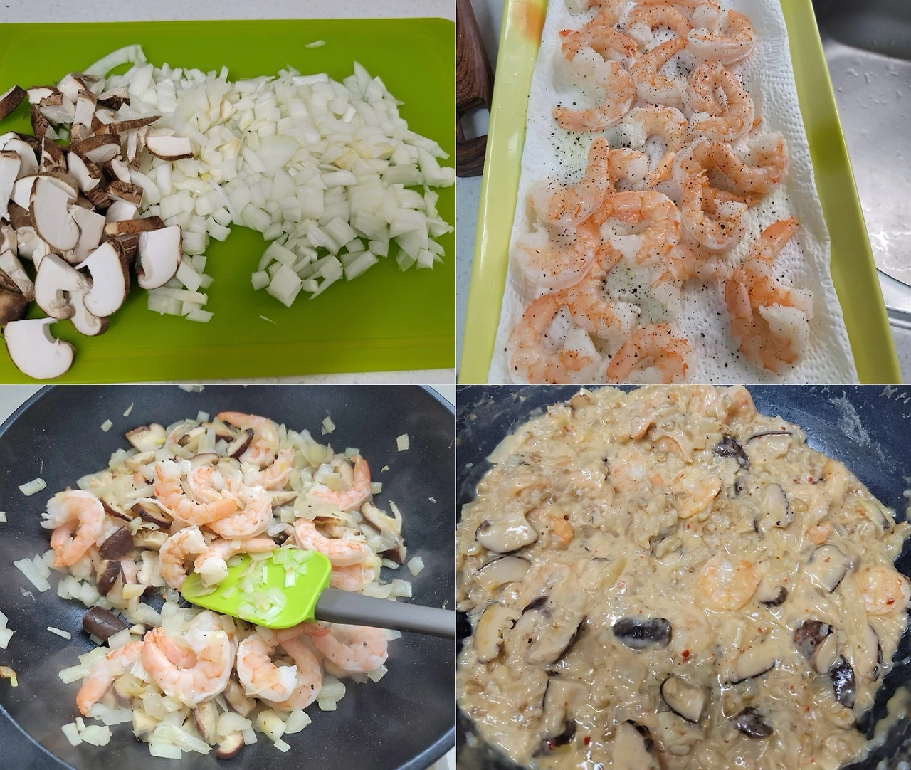 양파, 버섯 잘게 잘라놓고, 새우도 물기제거하고 소금 후추로 밑간을 한다.