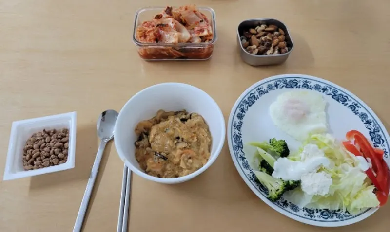아몬드 우유 리조또, 낫또, 김치, 견과류, 계란프라이, 양상추, 브로콜리, 파프리카 리코타 치즈 샐러드