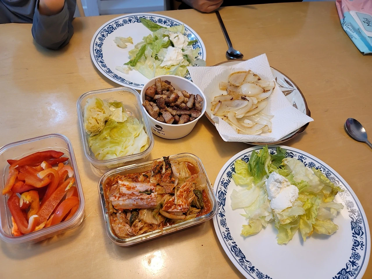 삼겹살, 리코타치즈 샐러드, 양파구이, 김치, 파프리카