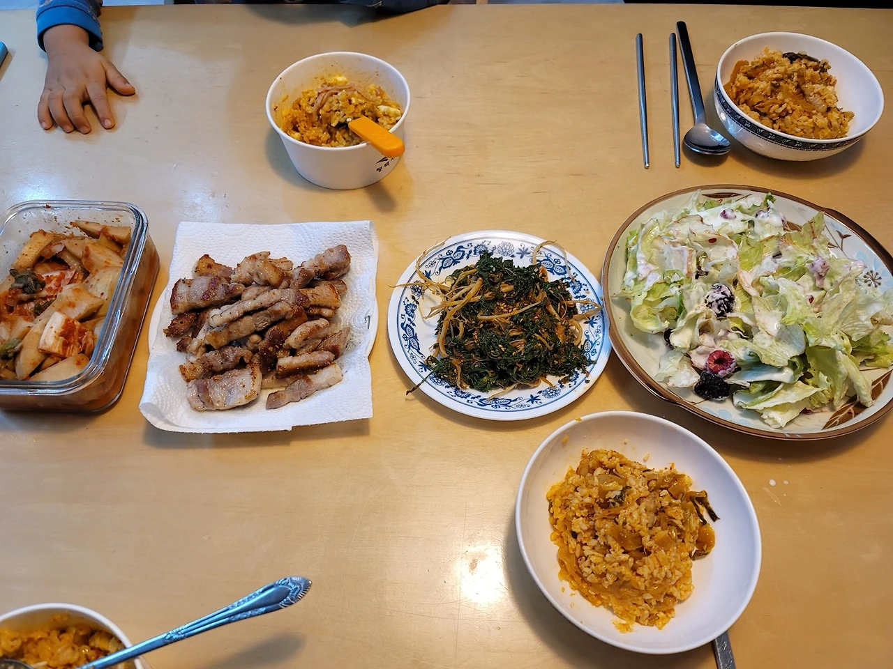 김치볶음밥, 삼겹살, 냉이무침, 양상추 샐러드(+딸기요거트)