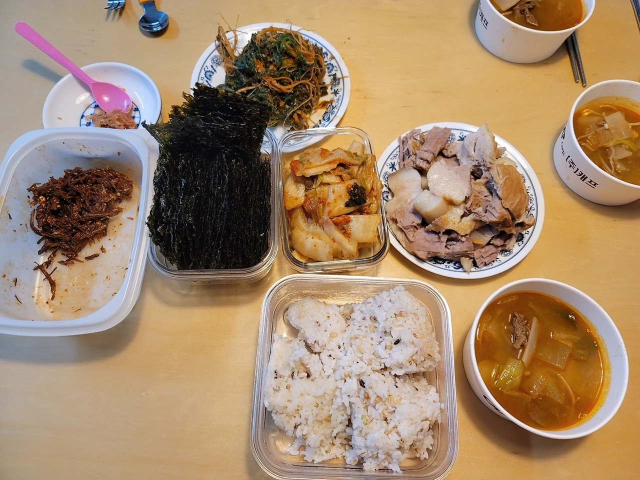 수육, 소고기 뭇국, 김, 냉이무침, 멸치, 김치 (+냉동딸기요거트)