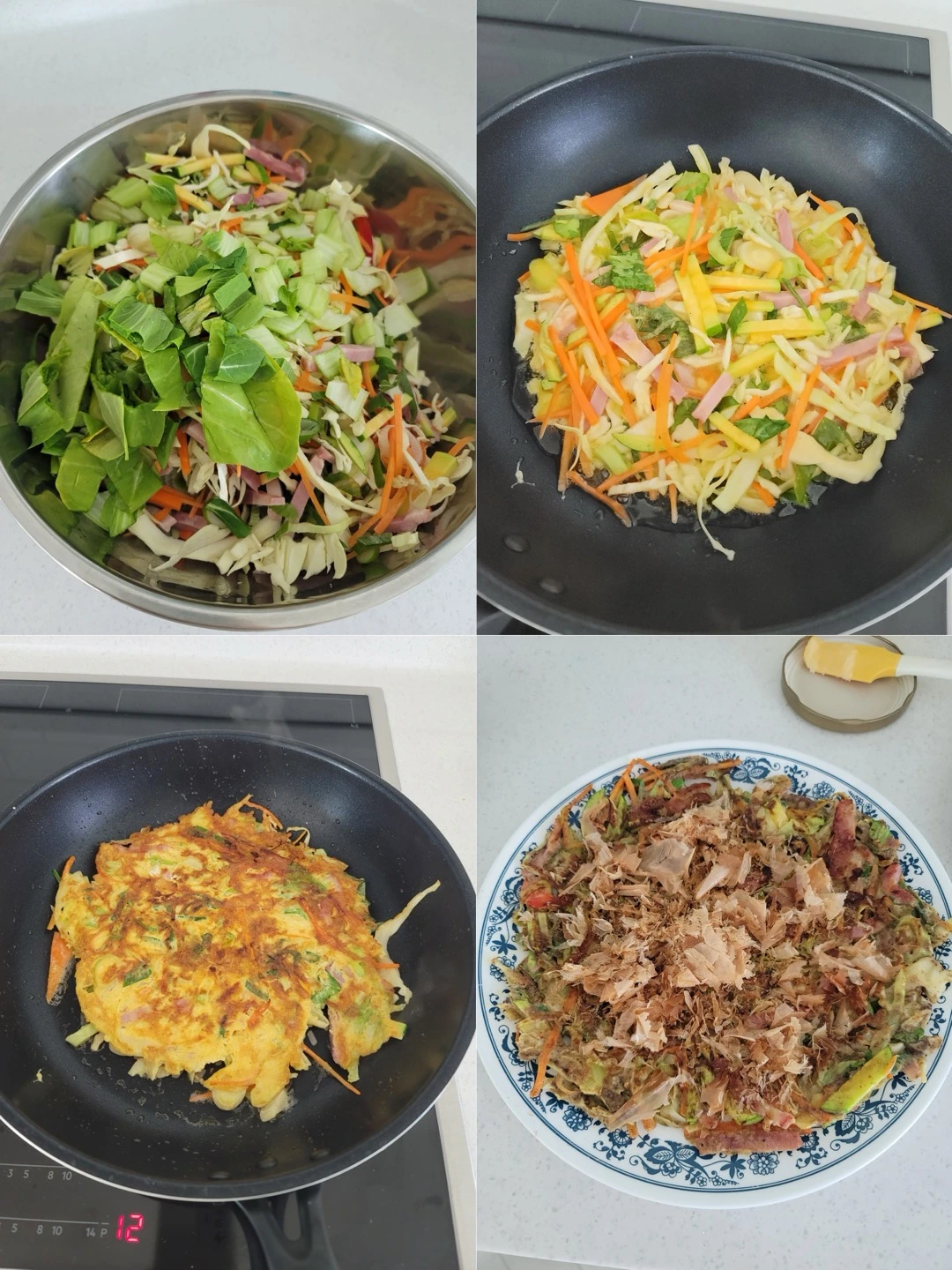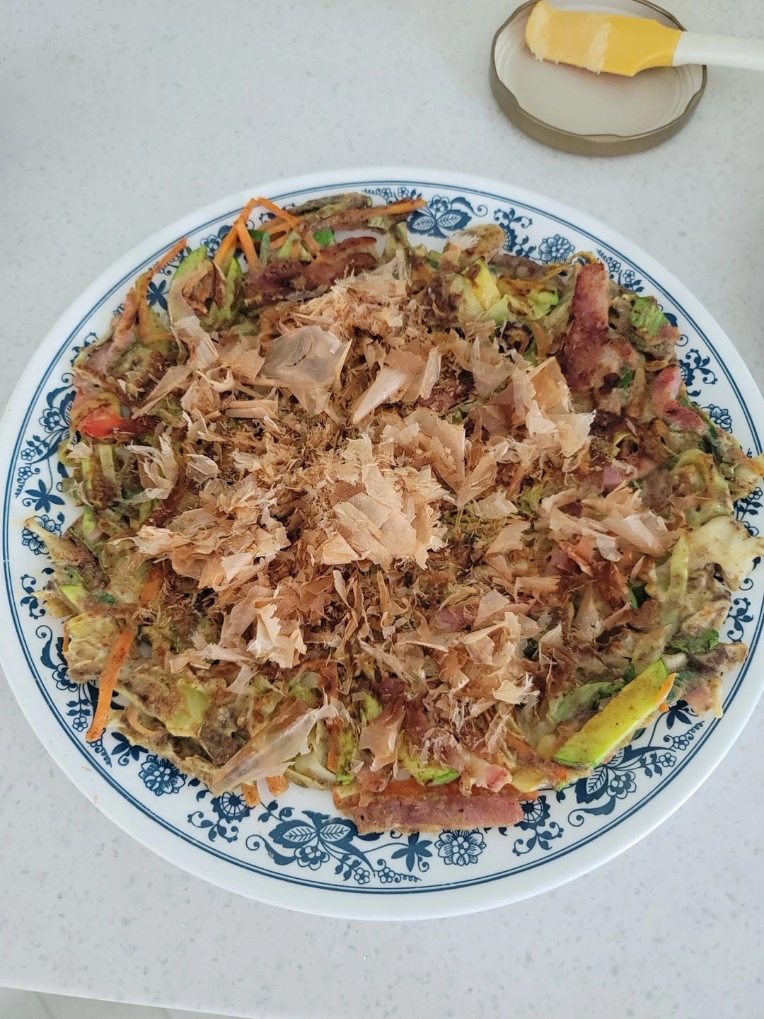 온갖 채소 잔뜩 집어넣고 부쳐서 가쓰오부시 살살 뿌려 내놓으니 건강한 야채 전이 되었다!