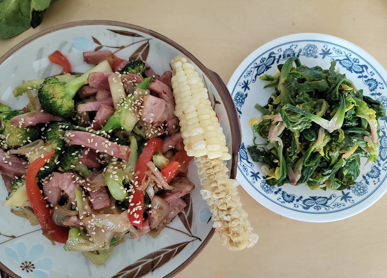 오리고기 베이컨야채볶음, 김치, 옥수수, 시금치나물