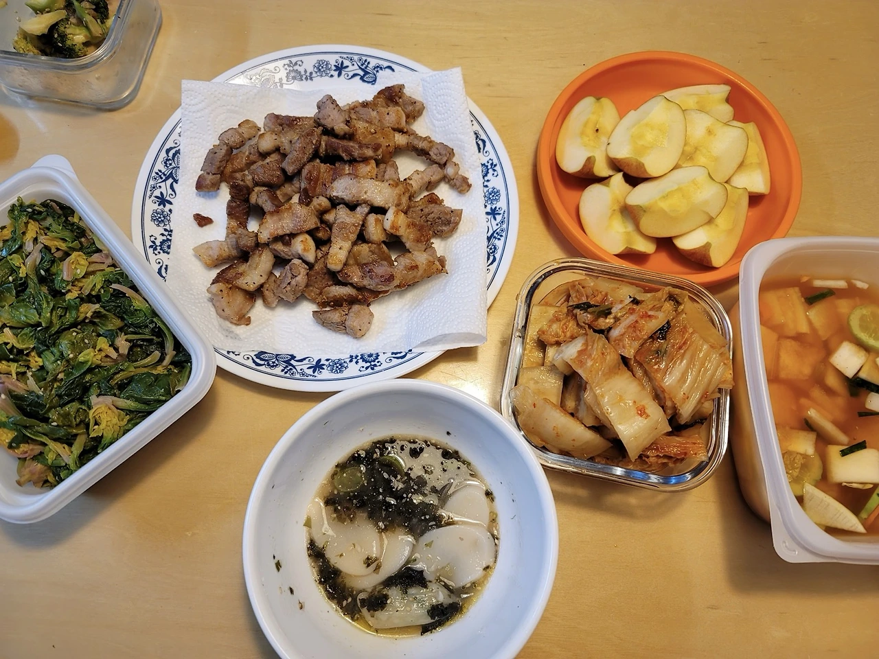 삼겹살, 떡만둣국, 밥, 김치, 시금치 (+트리플베리)