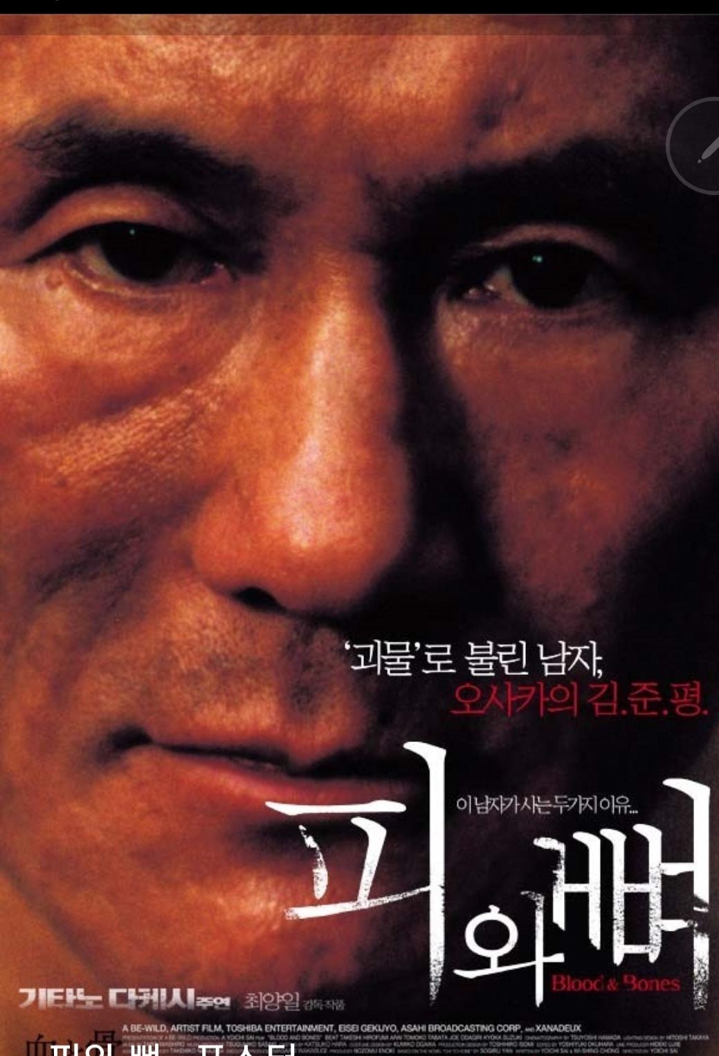 감독은 재일동포가 낳은 일본 최고의 감독 최양일의 작품이고 양석일의 자전적 소설을 바탕으로 만들었다. 주인공 김준평역에 기타노 다케시가 맡았는데 괴물 김준평을 연기하기에 적합한 외모를 가졌다. 다만 그의 우익적 행보가 마음에 걸리긴 하지만 순수하게 영화만 보자. 우리가 개인적인 표현의 자유를 집단적인 사유의 틀에서 공격하는 건 가끔 테러 같다는 개인적 생각도 덧붙인다. <피와 뼈>의 내용에 우리나라 사람들이 불편해할 사람들도 있겠으나 자전적 소설인만큼 있는 그대로 받아들이자. 그들의 인생이 일본과 우리나라의 역사 속에 펼쳐졌으니 어쩌겠는가! 북한을 이상향의 나라라 생각하고 결국 주위의 모든 사람에게 괴물이었던 김준평이 북한에 모든 재산을 바치고 쓸쓸히 죽어가는 장면이 제일 인상적이다.