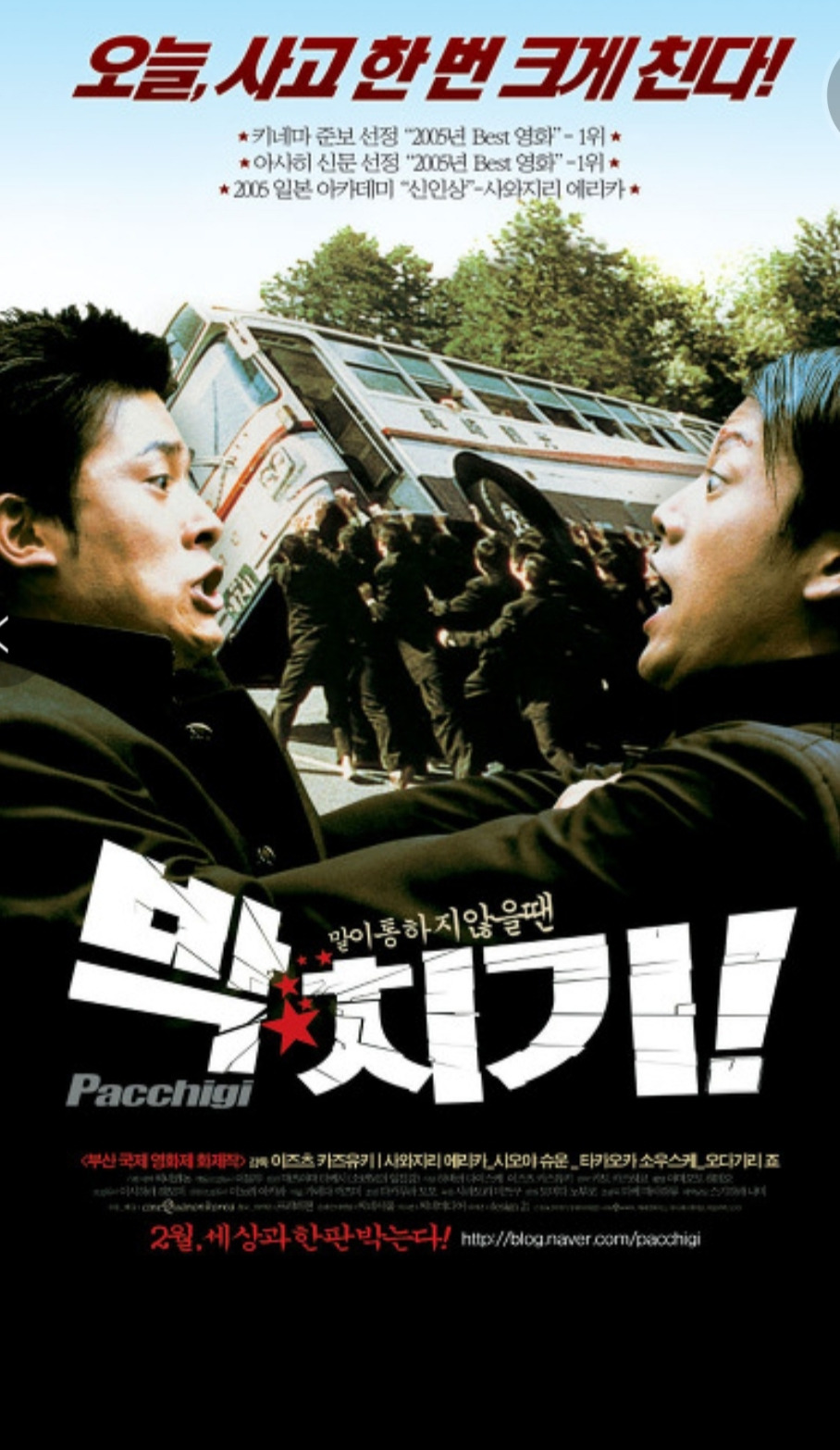 다음은 <박치기>이다. 2004년 일본 감독 이즈츠 카츠유키에 의해 만들어진 이 영화는 한, 일 관계가 가장 좋았던 시절인만큼 내용면에서 재일동포 이야기임에도 일본 내에서 폭발적 인기와 수상을기록했다. 50,60년대 일본 사회 내에서는 재일조선인에 대한 차별이 사회적 이슈가 컸던 때이라 일본 관객들은 자신들 나라에 대한 반성과 이해가 섞여 큰 인기를 끌었으나 우리나라에서의 흥행은 초라했다. 영화는눈물 나게 재밌고 한편으로는 일본에서 씩씩하게 살아가고 있는 재일동포들에게감사한 마음까지 든다.