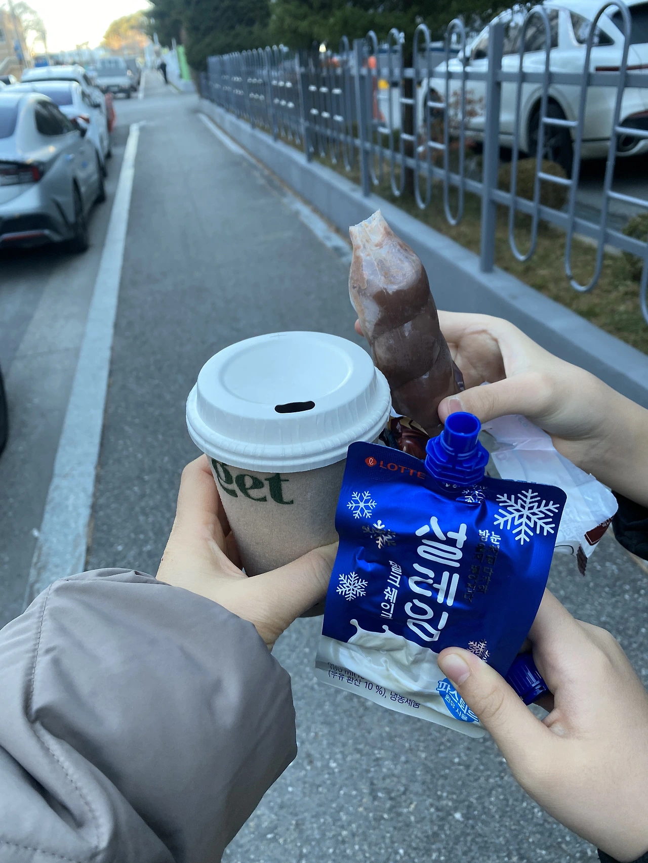 편의점에서 아이들은 아이스크림을 전 난방용 아메리카노를 사 들었습니다. 이 추위에 아이스크림이라니! 그걸 들고 나와 가는 길에 먹습니다. 이 겨울에 이 추위에 손을 호호 불면서 말입니다. 귀와 얼굴이 얼얼합니다. 콧물이 줄줄 흐릅니다. 제 손만은 따뜻합니다. 아이들은 찬 겨울에도 튜브 아이스크림을 빨아먹습니다. 손이 시리면 제 커피와 바꿔 들기도 합니다.