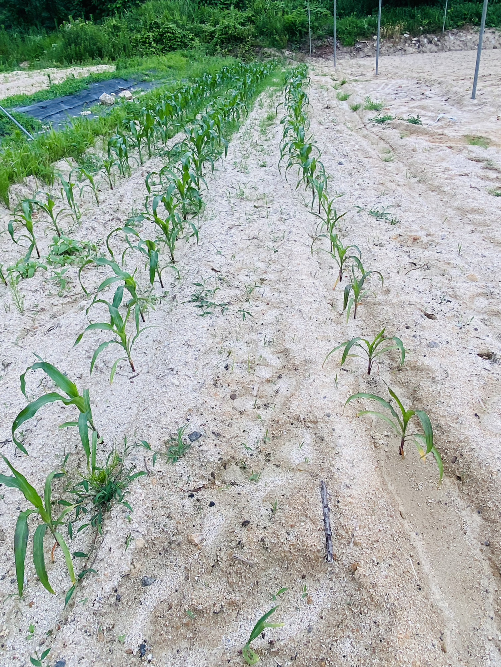 거센 비가 와도 걱정 안 와도 걱정, 해가 뜨거워서 또 걱정이다. 농부의 걱정이 무색하게 잡초는 원하지도 부르지도 않았데, 다 갈아엎고 뿌리를 뽑은 줄 알았는데 잘도 올라온다. 생강 심은 지 1주일째 작은 개미 군단과 같은 잡초들이 몰려온다. 건장한 녀석도 흙에 파묻혀 있다 올라온다. 보름 정도 된 옥수수 밭은 초록 경고등이 켜졌다. 잡초를 조금 더 키우면 뽑지 못할 지경이 된다. 주말에 탱자탱자 놀고 뭘 했을까. 저것을 곡괭이로 한번 갈아엎어줄 것을.