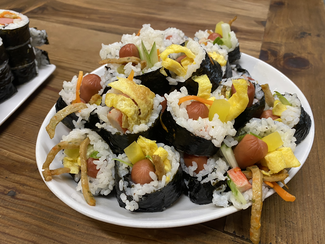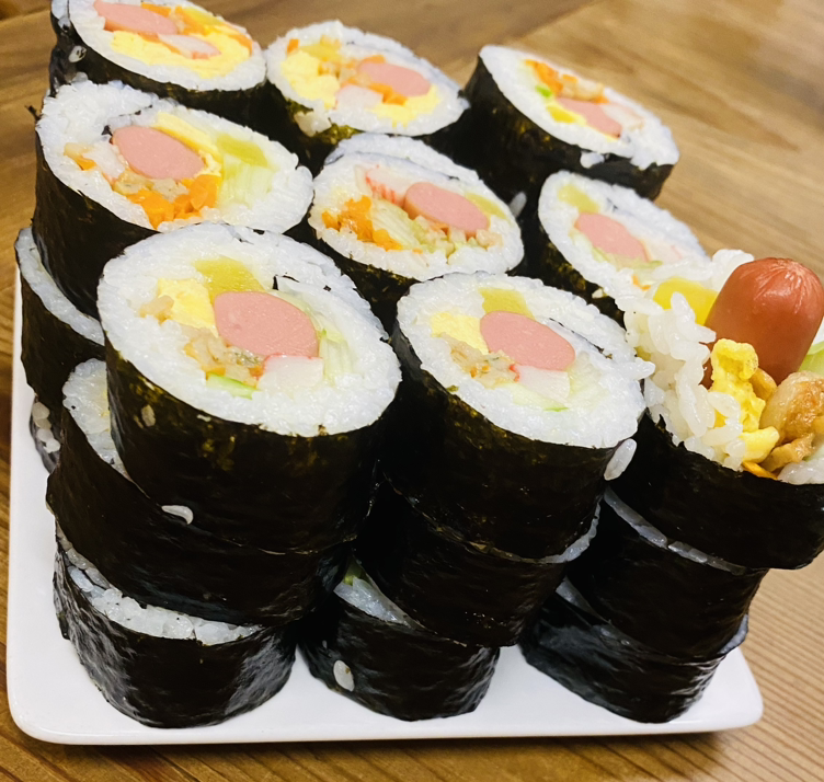 있다. 매일 먹어도 좋을 것 같다고 아이들이 인증해 준 김밥. 후랑크 소시지 김밥이다. 핫도그용 소시지 크기의 후랑크 소시지가 주 재료다. 20분 차를 타고 옆 동네 마트에 가서 사 온다. 우리가 넣는 소시지의 총량은 1킬로그램, 삼시세끼 김밥을 싸 먹어도 되는 양이다.