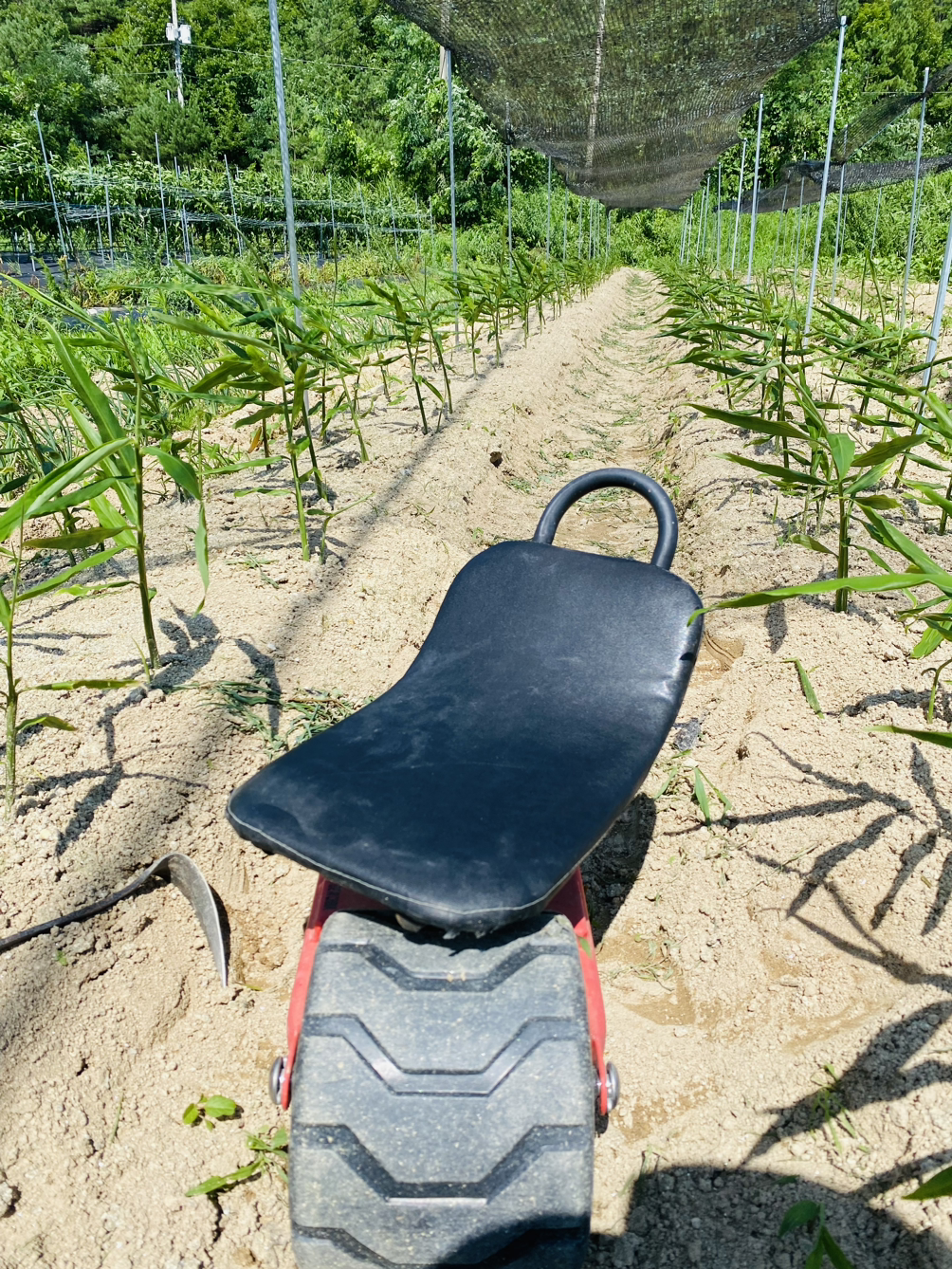 장비는 늘 한결같다. 호미 한 자루. 앉은뱅이 의자보다 먼저 눈에 띈 바퀴 달린 의자를 가지고 나왔다. 외발 수레 처럼 밭고랑에 놓고 쓰기 딱 좋다. 커다란 앞바퀴와 뒷바퀴가 철커덩거리는 쇠붙이에 연결되어 있다. 오늘은 네가 나의 돗자리로구나.