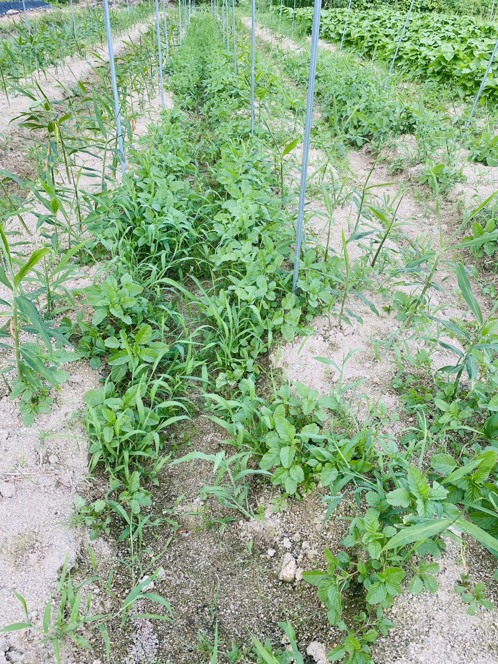 일주일 새 다시 풀밭이 되어버린 생강 밭. 풀이 자란 만큼 생강도 자랐다. 난감하다. 애정을 쏟으면 괴롭다. 농부 아낙은 지난주와 같은 모습으로 정갈하게 앉아 풀과 담판을 지었다. 지난주 풀은 아기 풀이었는데 이번에는 형님 풀이다. 손가락으로는 절대 겨룰 수 없고 손으로 한번 휘어 감아 뽑아내야 한다. 씨름 선수가 샅바를 잡는 원리와 비슷하다. 뿌리와 줄기 사이 적당한 지점에 순간적인 힘을 줘야 뽑혀 나온다. 농부 아낙은 한동안 씨름 선수가 되었다. 지난주 맨 풀이 왜이지경인고 하니. 농부 아빠의 솜씨다. 농부 아낙이 맨 곳은 그나마 멀쩡하다. 반 골을 맸을까 농부 아빠가 또 들어가자고 한다. 모기가 많다나? 여긴 생강밭이라 그런가 모기 소리 안 들리는데? 생강이 매워서 모기가 근처에 없는 것일까? 한 골을 꾸역꾸역 다 매고 기쁨의 눈으로 뒤를 돌아보니 풀무덤이 띄엄띄엄 보인다. 저녁에 선선한 바람에 뽑힌 풀뿌리가 살아나 젖 먹던 힘까지 내 땅속으로 기어갈까 걱정이 되었다. 쇠스랑을 들고 나와 설설 긁어내 밭 가에 가져다 휙 내던졌다. 제발 들러붙지 마라.