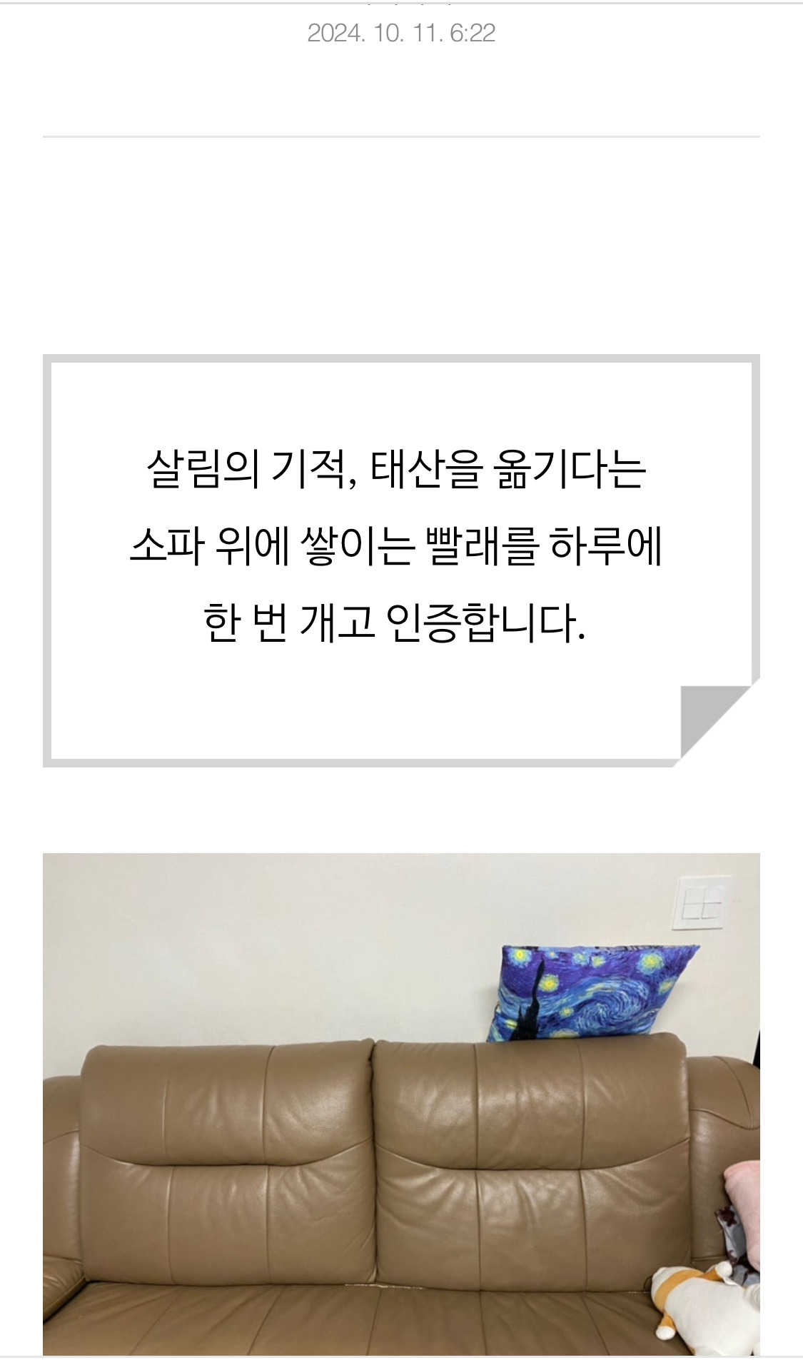 아침에 일어나자마자 세탁기를 돌리는 것처럼 습관이 되기를 기대해 봅니다. 집에 오면 제일 처음 하는 자연스러운 일과가 되면 태산을 옮기는 기적이 이루어지는 겁니다. 기적 이루기 참 쉽습니다. 작지만 큰 기적을 내 손으로 만들어낸다니 벌써부터 뿌듯합니다.