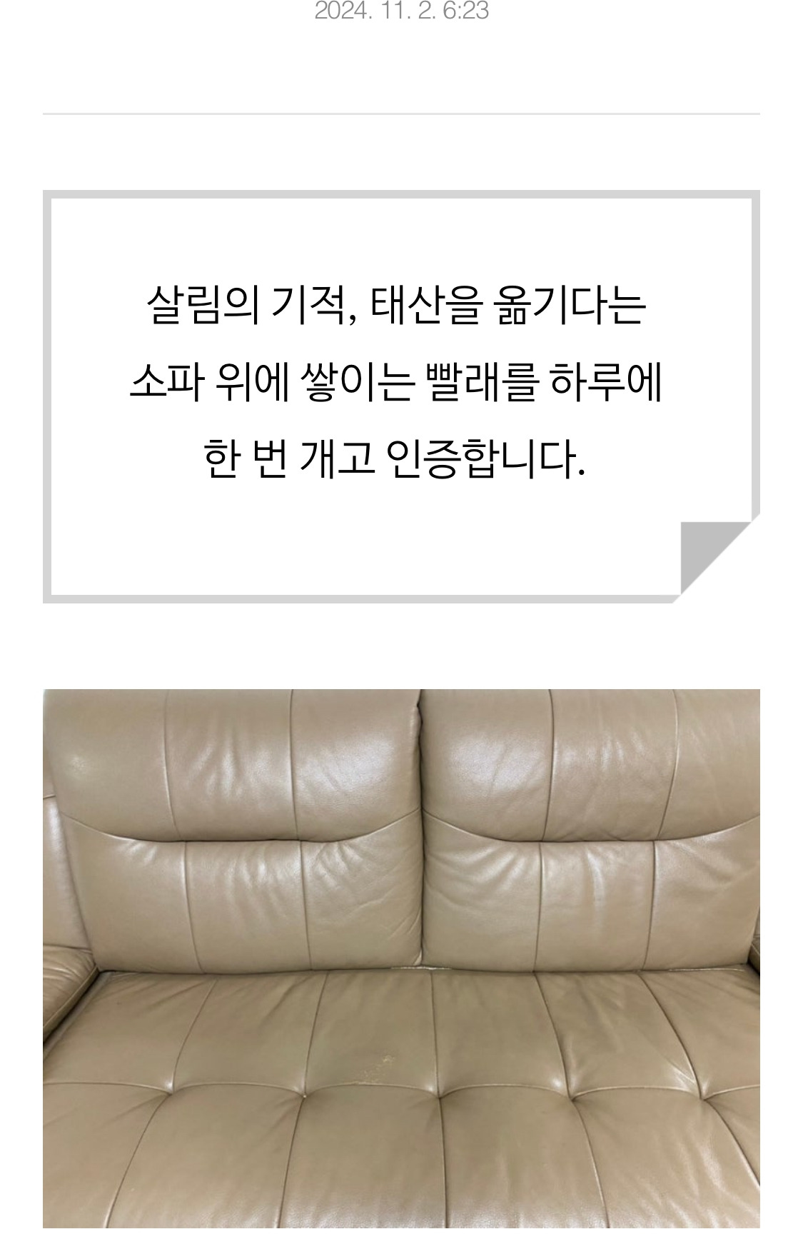 모두의 손으로 소파를 지킵니다. 입으로 아이들에게 빨래 개기를 시키던 남편도 앉았습니다. 옷 몇 개를 넘겨줬더니 갭니다. 정말 갭니다. 어제는 양말 몇 개 깨작거리는 수준이었는데 오늘은 진심을 다해 열심히 합니다.