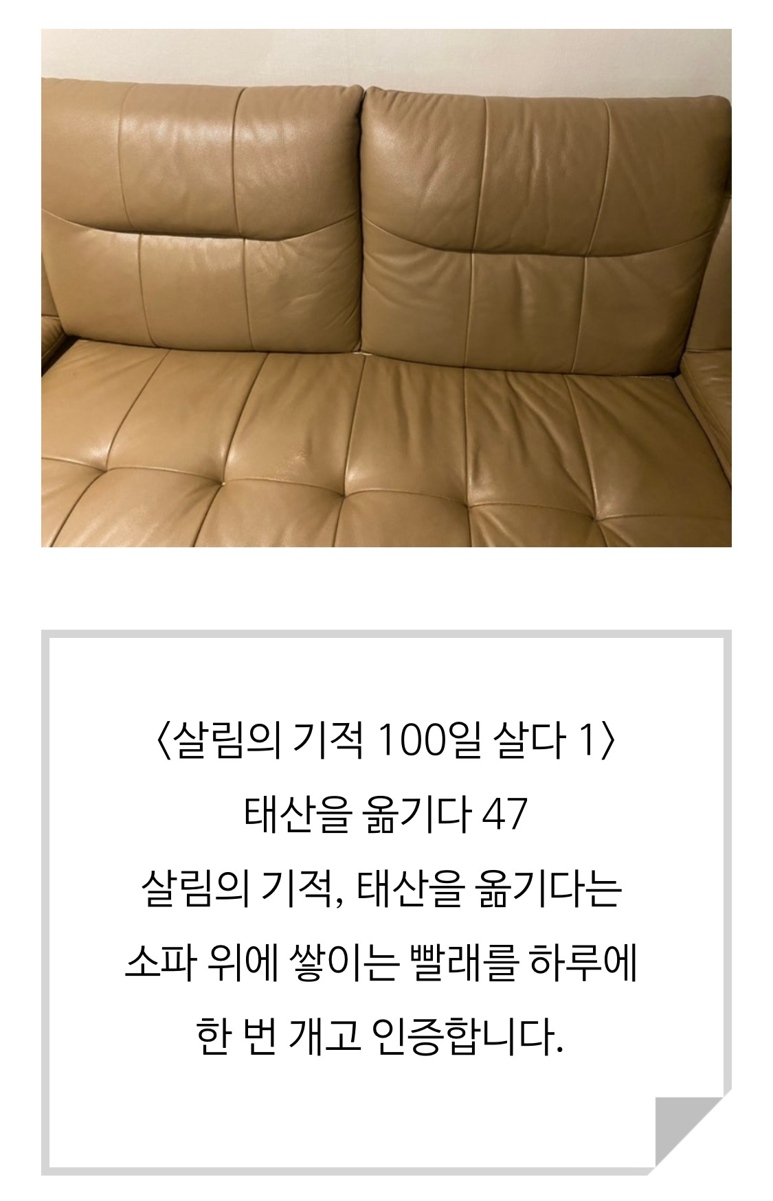 새벽의 소파는 말끔했다. 다 된 빨래가 나오기 전 서둘러 인증 사진을 찍었다. 꼼수란 이런 것이다. 미뤄봤자 몰아서 저녁에 모두 해야 하는 일이지만 지금 당장 안 하는 게 기쁘단다. 어제 늦은 밤 빨래 정리를 하고 잤기 때문에 덕을 보는 것이라 생각하기로 했다. 내 덕을 내가 좀 보는 것인데 꼼수 정도는 부릴 수 있지 않을까?