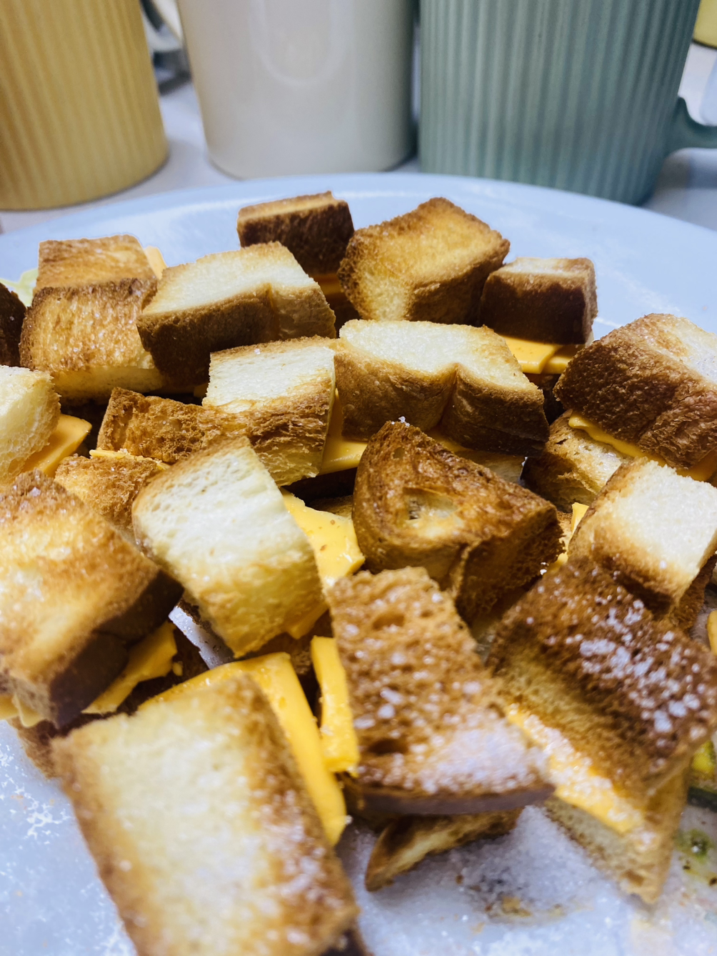 하얀 식빵의 까맣게 탄 부분을 잘라내고 프라이팬은 포기했다. 에어프라이어에 시간과 온도를 정해놓고 돌렸다. 바삭하니 맛있었다. 기분 전환을 위해 설탕을 골고루 뿌려줬다.