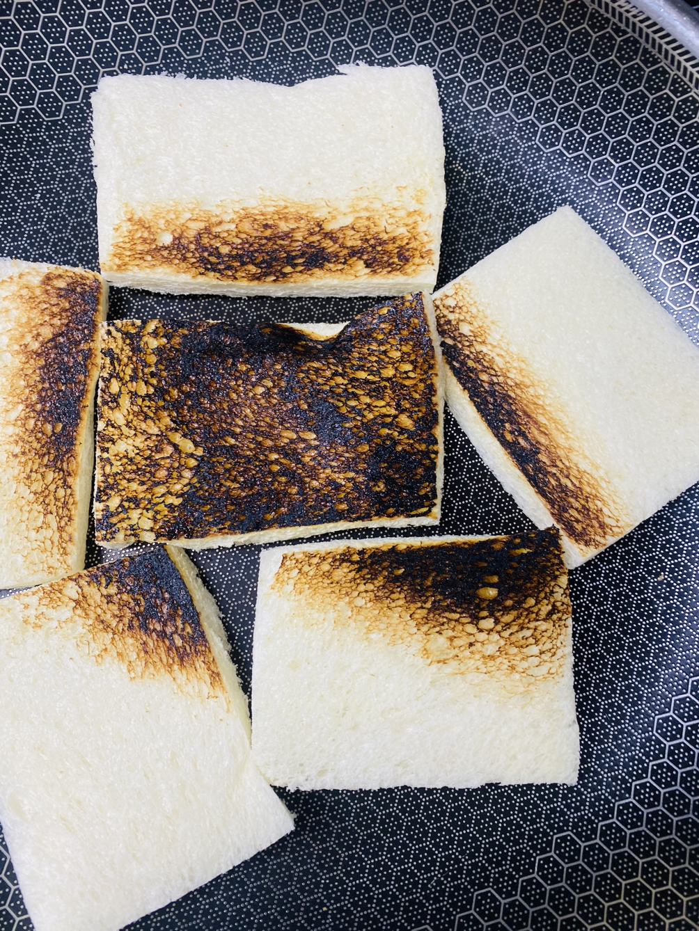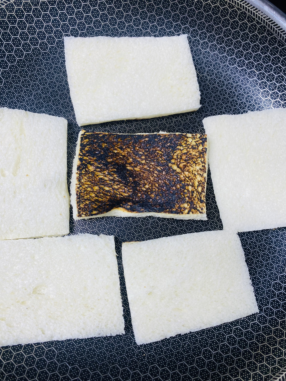 식빵 테두리를 잘라 에어프라이어에 굽는다. 중간의 하얀 빵 부분은 프라이팬에 살짝 구워 중간에 치즈를 한 장 끼워 먹으면 바삭하고 맛나겠지? 프라이팬 예열을 하고 빵을 올렸다. ‘어머나 빵 부스러기가 바닥에 많이 떨어졌네. 청소기 한 번 돌릴까? ’ 하며 주방을 한 바퀴 휘~ 청소했다. 그러는 사이 어디선가 탄내가 올라왔다. 정말 한 바퀴만 휘 돌렸는데 그 짧은 시간을 참지 못하는 녀석들.
